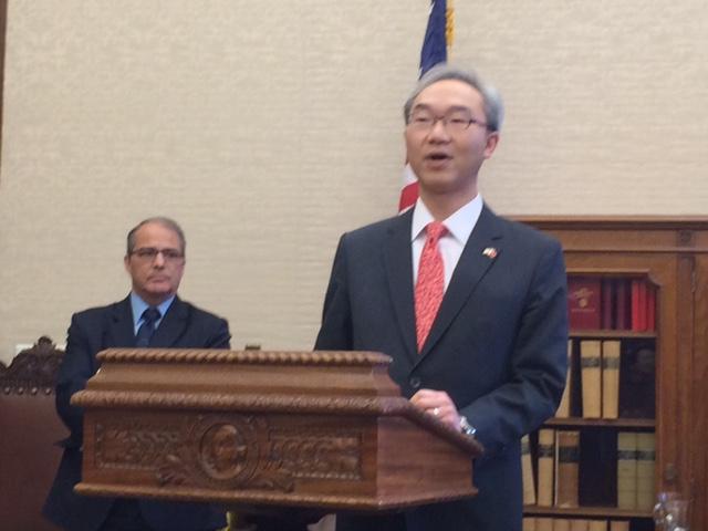 駐西雅圖辦事處姚金祥處長105年12月14日上午主持假華盛頓州Brad Owen副州長辦公室舉辦之招待會,以褒揚O副州長擔任副州長任內5度應邀訪華,長期支持臺灣與華州雙邊關係之貢獻。並感謝O副州長夫人贊助國人吳宗鳳博士於O副州長辦公室廊廳辦理畫展之盛情。