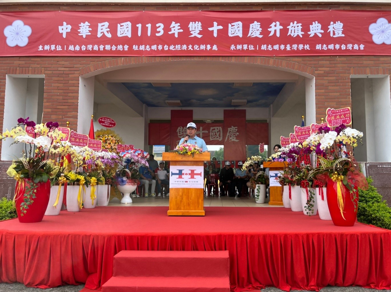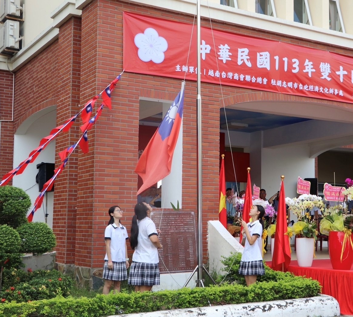 本處韓國耀處長於10月6日偕駐處同仁與越南南部各地台商及僑胞齊聚胡志明市台灣學校參加中華民國113年國慶升旗典禮。青天白日滿地紅國旗在全體肅立致敬中冉冉升起,氣氛莊嚴隆重。
