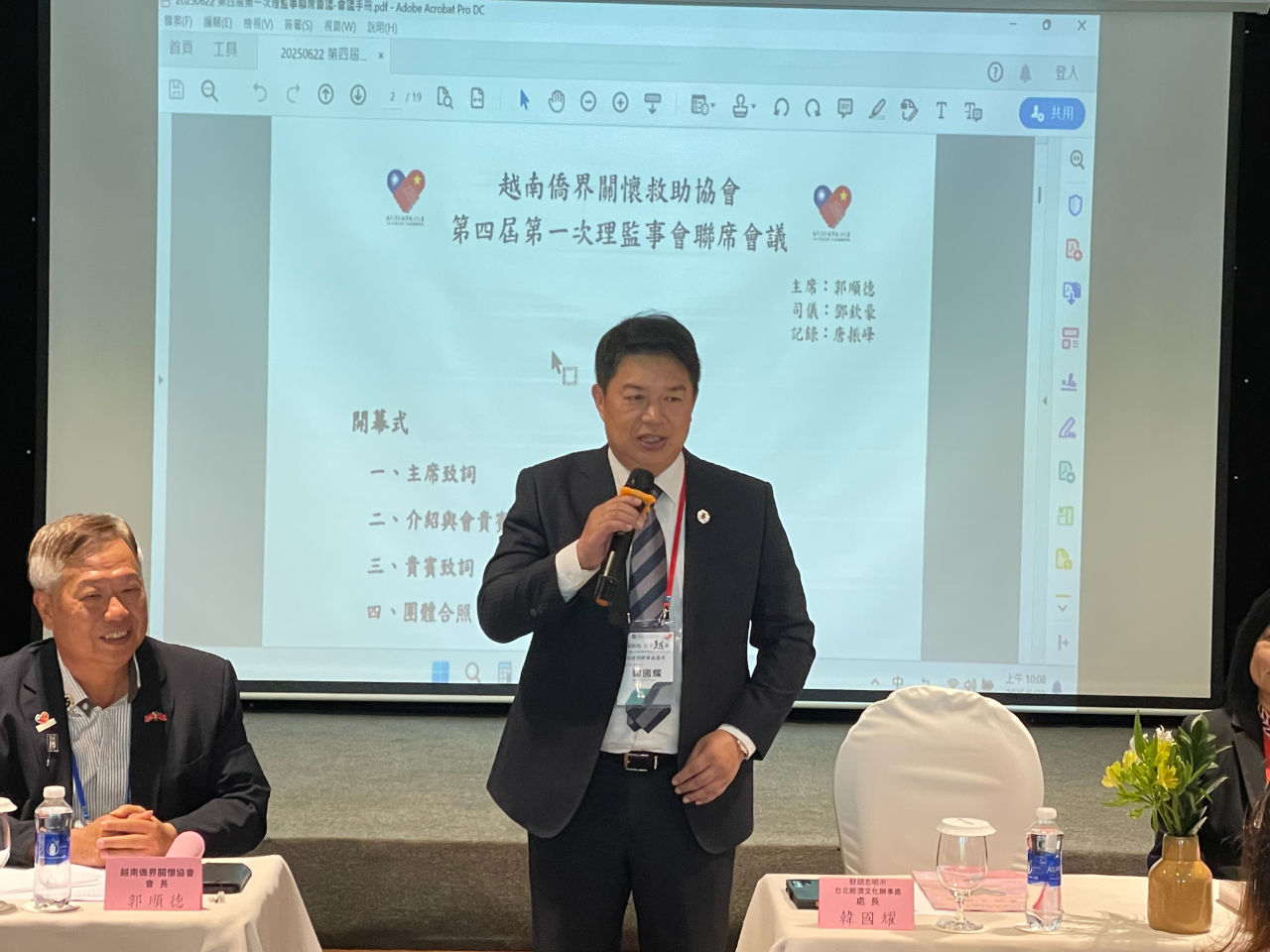 越南僑界關懷救助協會於2025年6月22日在林同省舉行「第四屆第一次理監事聯席會議」,由會長郭順德主持。本處韓處長國耀應邀出席,並致詞感謝關懷協會多年來協助處理我國人急難救助案件貢獻卓著,展現人道精神與行動效率。