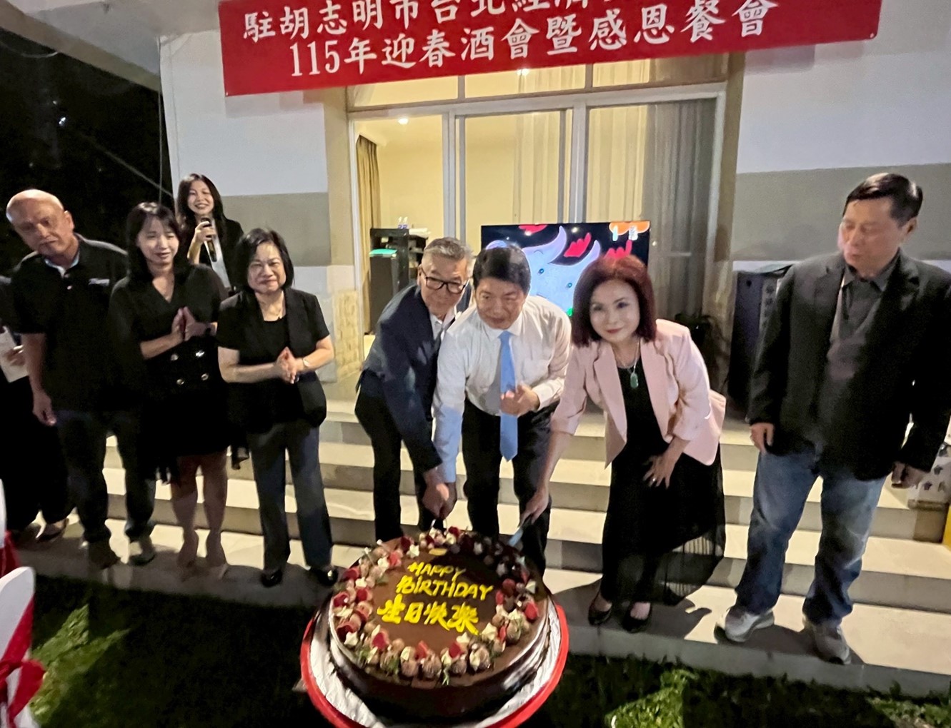 為感謝此間僑界及台商過去一年來對本處的支持與協助,本處韓國耀處長於3月27日晚間在職務宿舍舉辦「115年迎春酒會暨感恩餐會」,邀請南越地區及柬埔寨之僑務榮譽職僑領、越南台灣商會聯合總會暨10個分會、柬埔寨台商協會、越南及柬埔寨台灣客家聯誼會、越南僑界關懷救助協會、世華婦女會越南分會、青商會、越南彰化同鄉會、越南碳中和科技聯盟協會、台灣家具聯盟公會、越南家扶中心、巧聖廟、台商自行車業聯誼會、胡志明市台灣學校、越華國際學校、越南留台校友會、17家台灣金融、保險公司、3家台灣航空公司、越南台商高爾夫大聯盟暨8支球隊、台資企業負責人等各界嘉賓近200人與本處同仁歡聚一堂並席開21桌,一起分享溫馨美好時刻,共度歡樂愉悅之春酒盛宴。