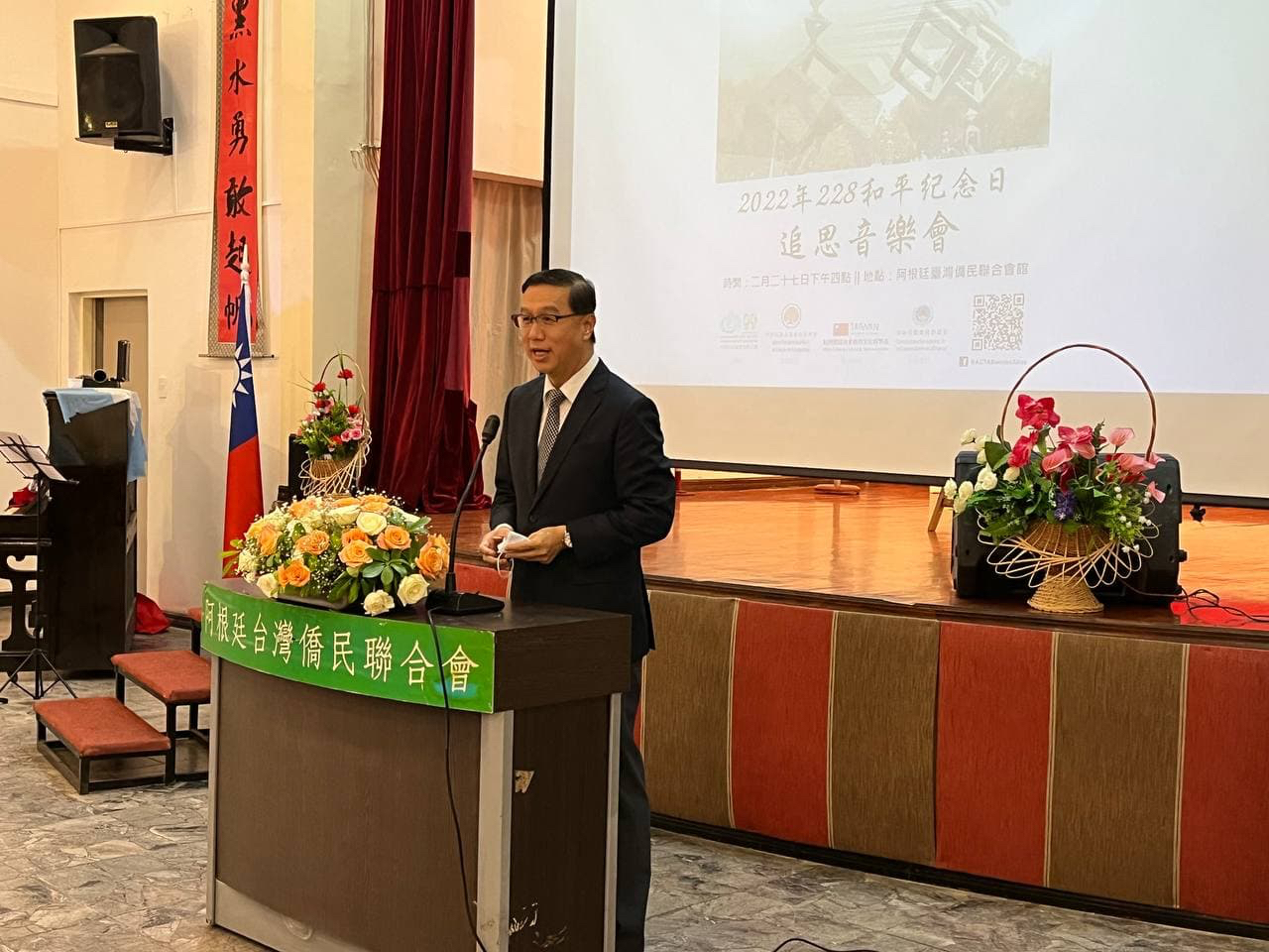 黃理事長開場表示,希望透過這次的活動,讓大家認識228事件真相,並以寬容原諒的心情面對。曹大使致詞表示,不忘過去的教訓,台灣不容威權,堅持民主,藉由這場音樂會撫慰過去為推動台灣民主而犧牲的國人及家屬,並提到日前經濟學人資訊社(EIU)公布2021民主指數報告,台灣排名亞洲第一名,是何等的驕傲,美國傳統基金會報告指出,台灣的經濟自由度是亞洲第二名、全球第六名,這是大家努力的成果。