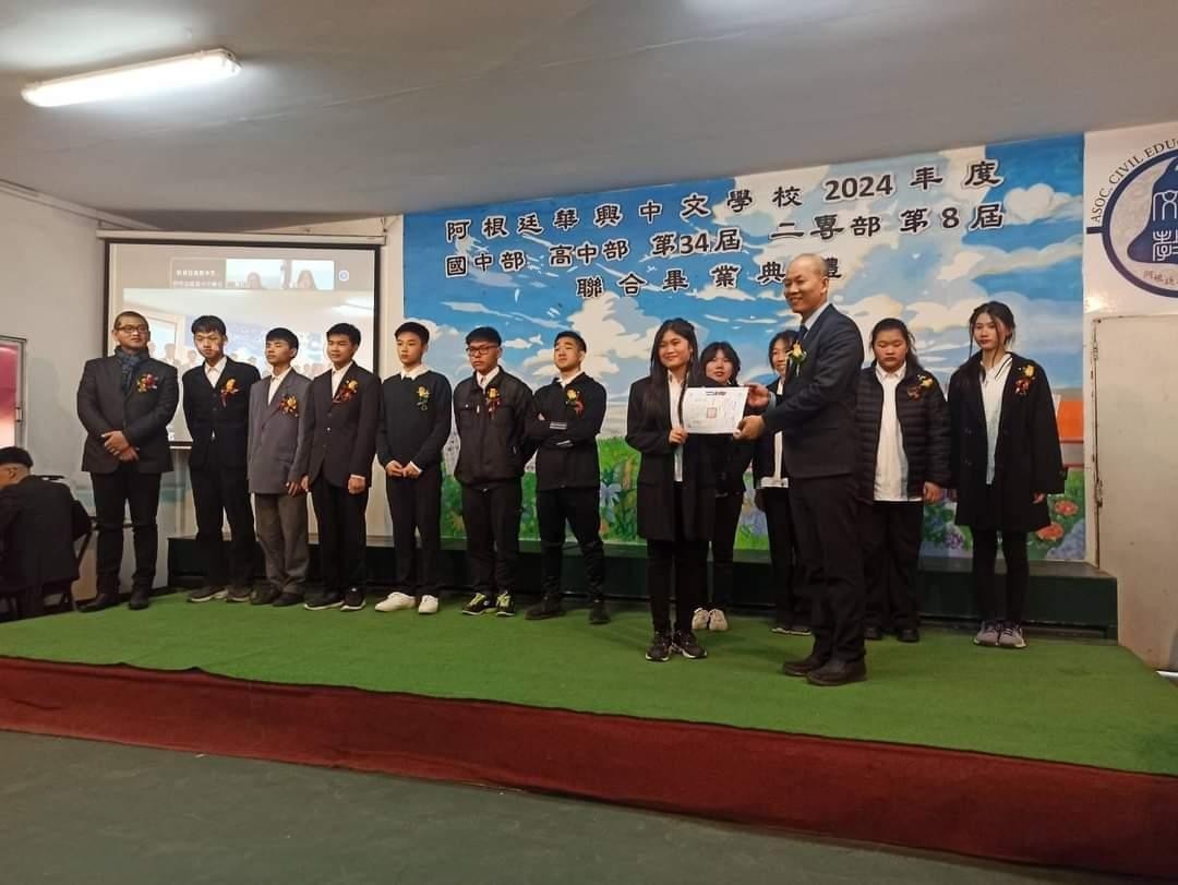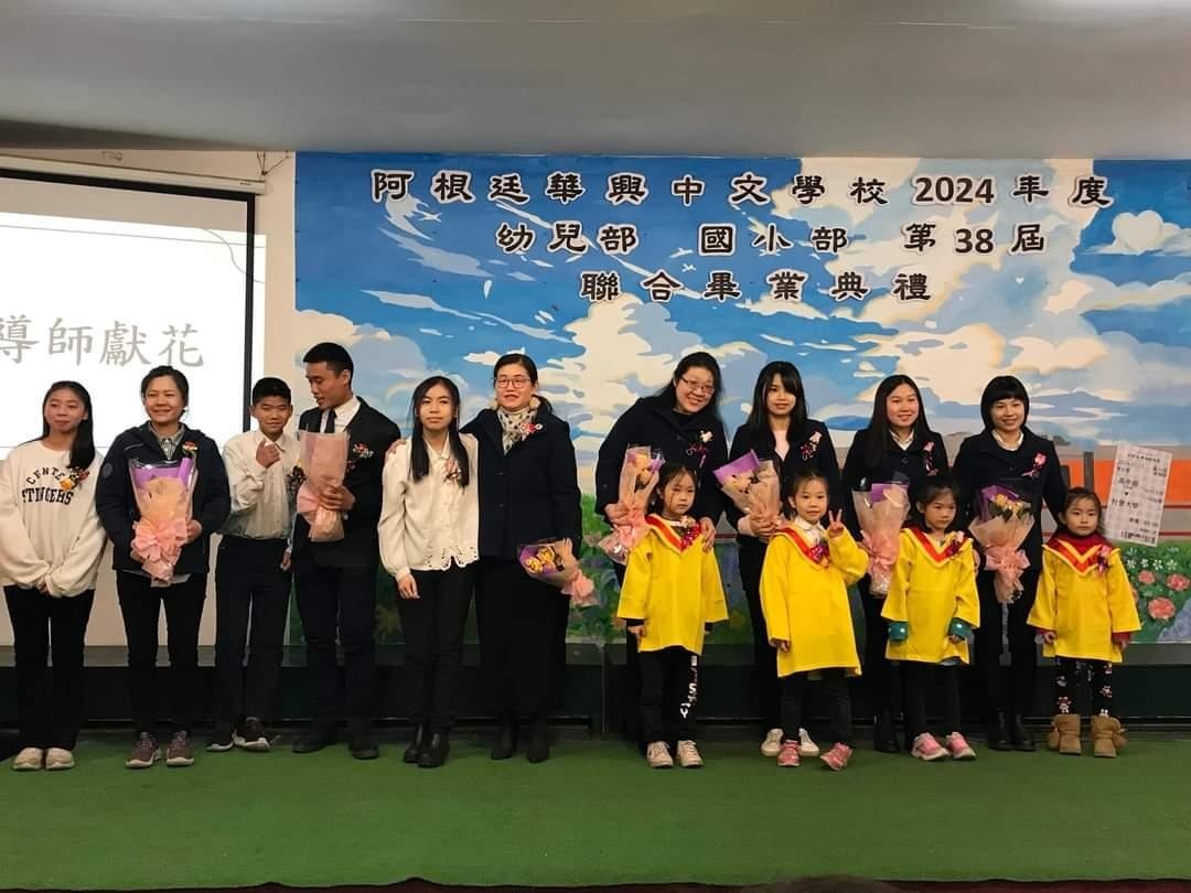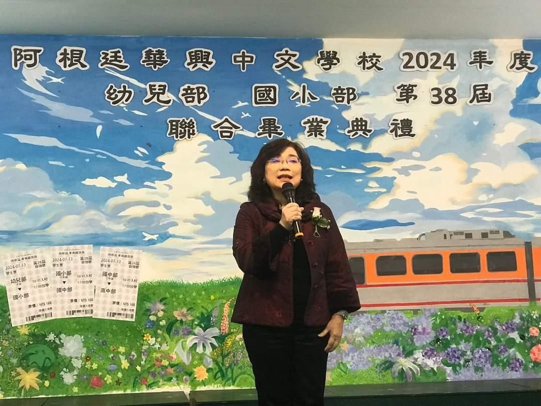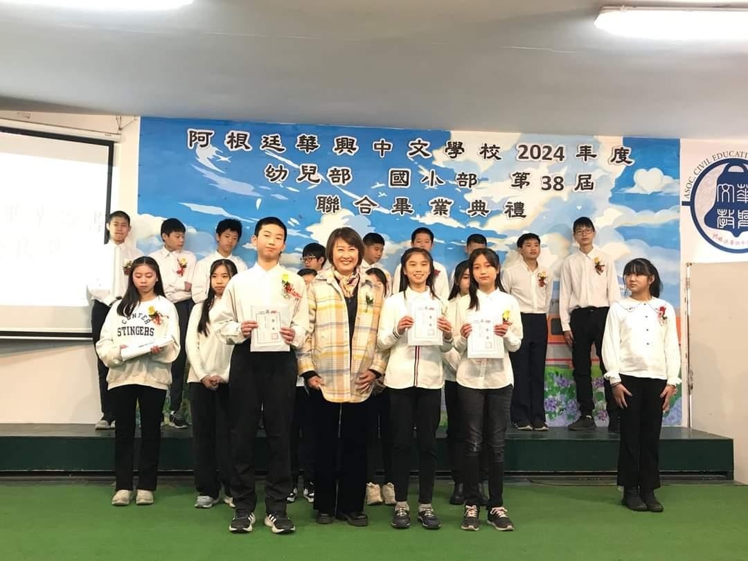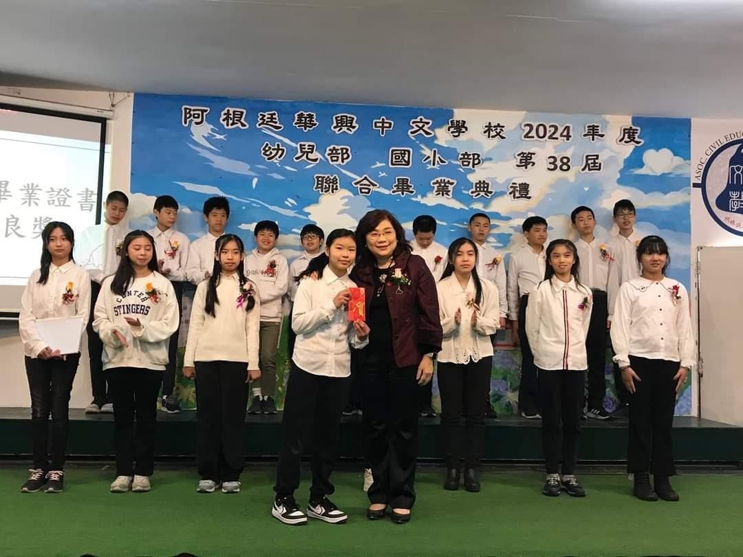駐阿根廷代表處謝大使妙宏於本(113)年7月13日應華興中文學校邀請,出席幼兒部、小學部、國中部及高中部聯合畢業典禮,恭喜全體畢業生完成階段性學習,並頒贈「大使獎」給各部傑出畢業生。謝大使另在張校長建坦陪同下,勉勵華語部的阿根廷學生,以及參訪文化走廊所展示的學生學習華語文成果。