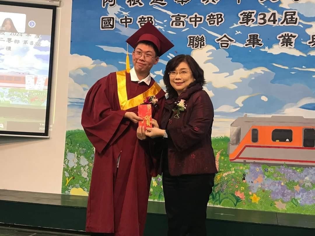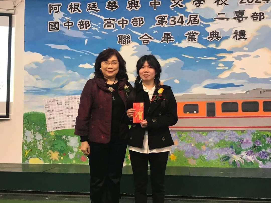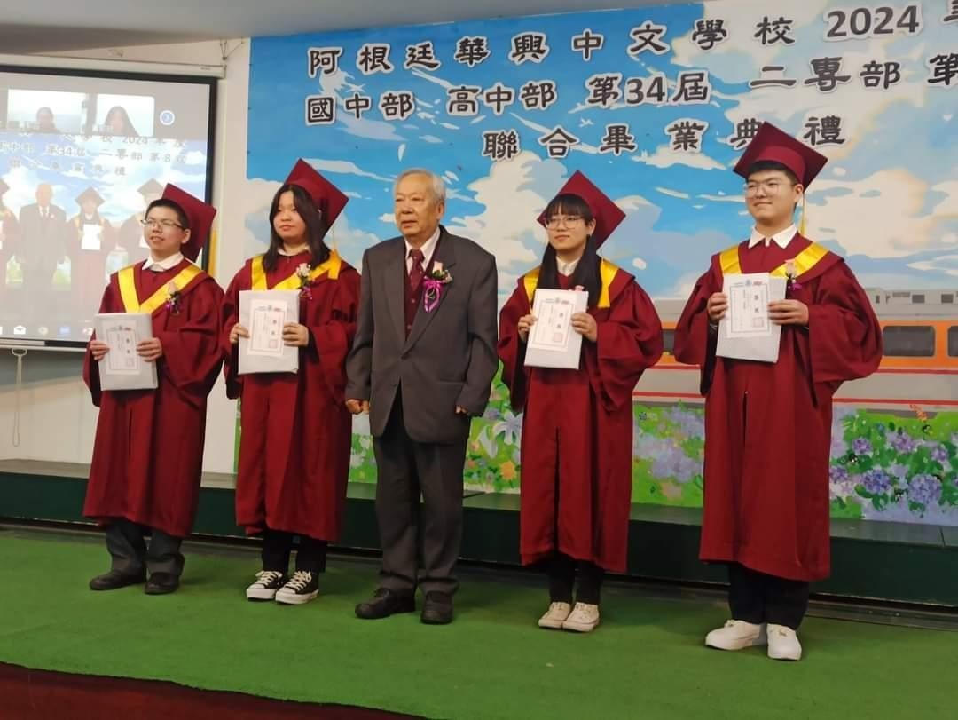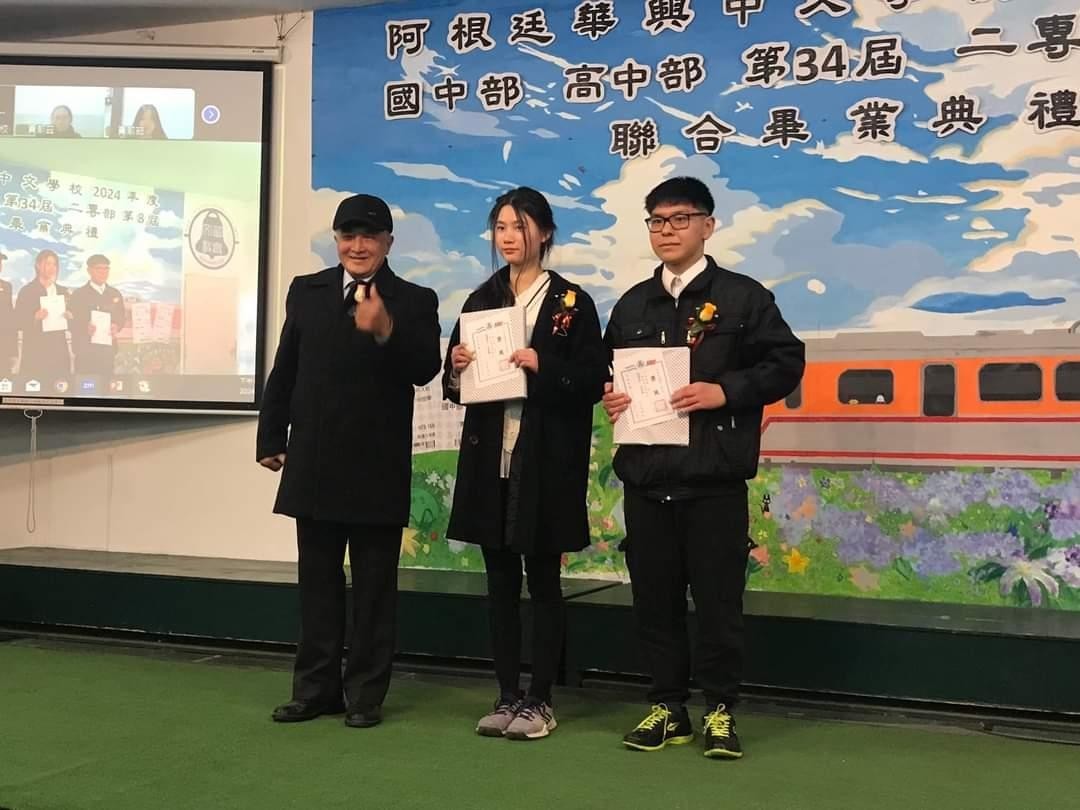 典禮上由楊僑務委員振壽、葛僑務委員道爭等僑領頒贈各部成績優良獎,在校生代表發表對畢業生的祝福感言,以及畢業生代表致贈花束表達對師長的感謝,會場充滿溫馨及感恩。