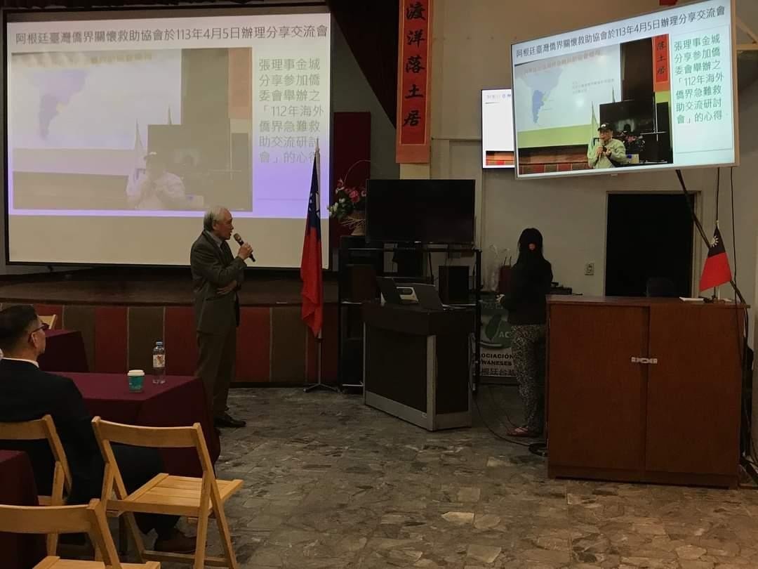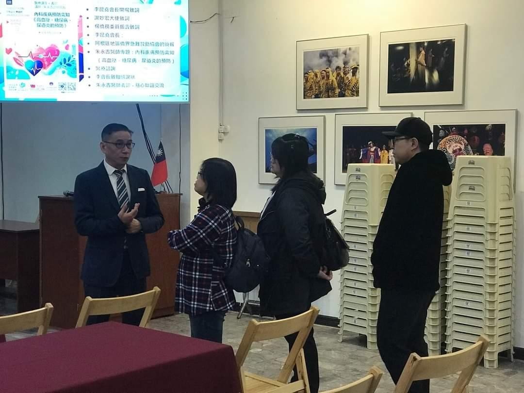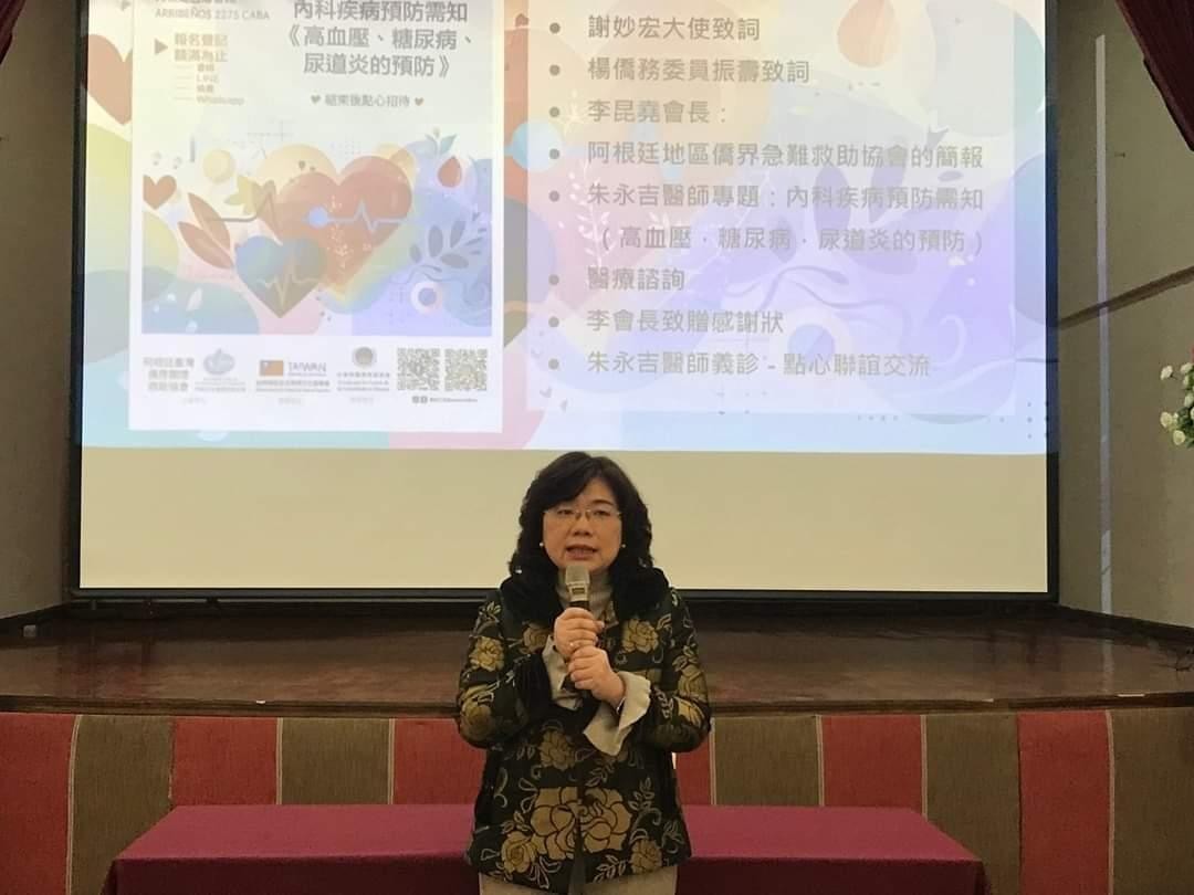 阿根廷台灣僑界關懷救助協會於本(113)年8月4日在台灣僑民聯合會館舉辦醫療講座,邀請旅阿知名台僑醫師朱永吉醫師以「內科疾病預防須知《高血壓、糖尿病、尿道炎預防》」為題進行專題講座,並提供醫療諮詢及義診。本處謝大使妙宏應邀偕駐處同仁一同與會,計有台灣僑民約150人參加,現場座無虛席。