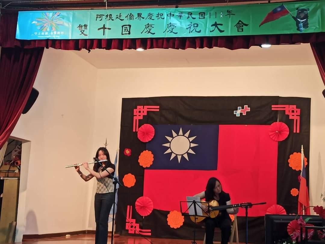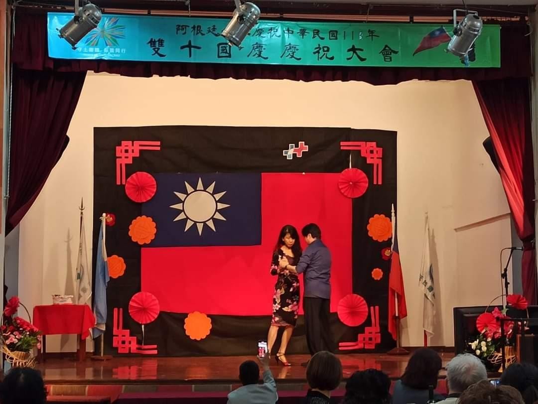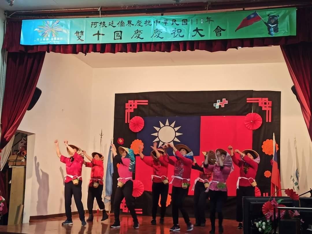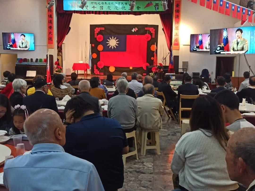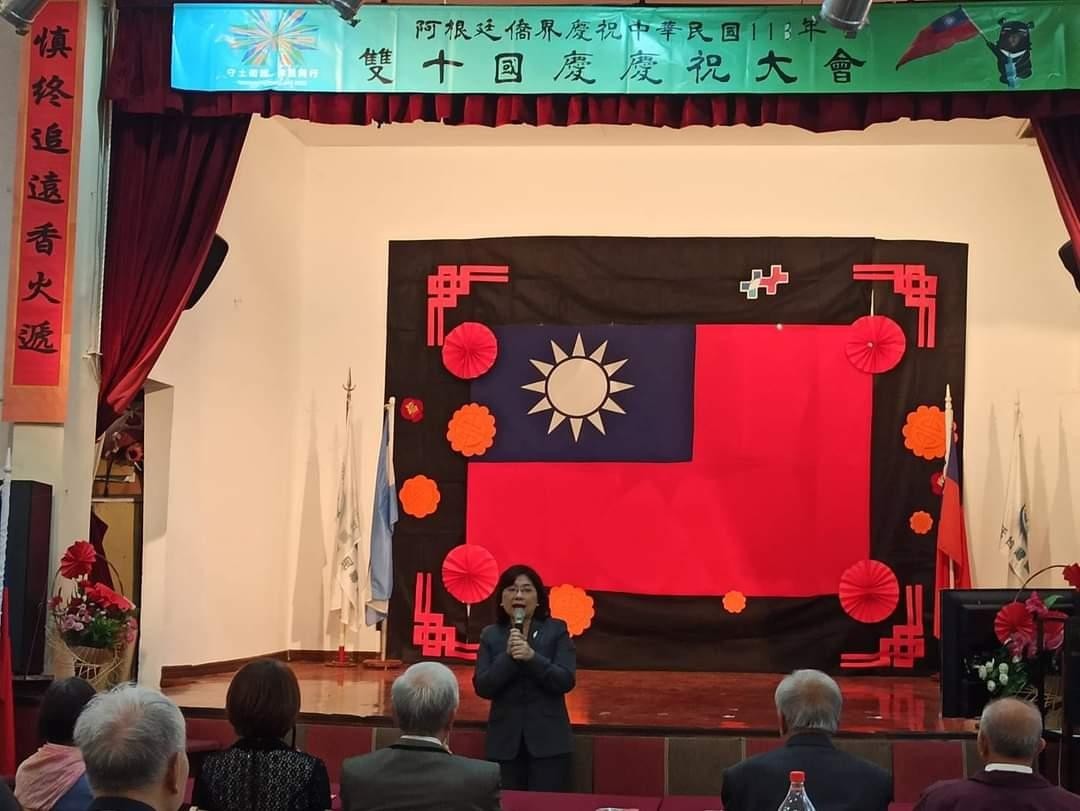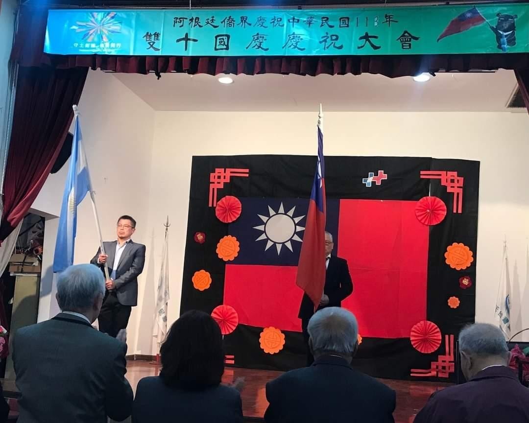 本處謝大使妙宏於本(113)年10月6日下午應阿根廷台灣僑民聯合會邀請,偕駐處全體同仁出席「阿根廷僑界慶祝中華民國113年雙十國慶慶祝大會」,計有旅阿僑民及阿國友人200餘人參與,全體迎中華民國及阿根廷國旗進場,並齊聲高唱中華民國及阿根廷國歌。