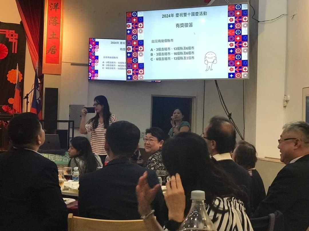 大會中安排全體聆聽僑務委員會徐委員長與全球僑胞一同慶祝中華民國113年雙十國慶談話,以及「龍獅鼓樂」、音樂演奏、採茶舞、探戈秀及名歌演唱等表演,現場就台灣時事設計「有獎徵答」。接著僑聯會李理事長昆堯及謝大使引領切生日蛋糕,祝中華民國國運昌隆、生日快樂!