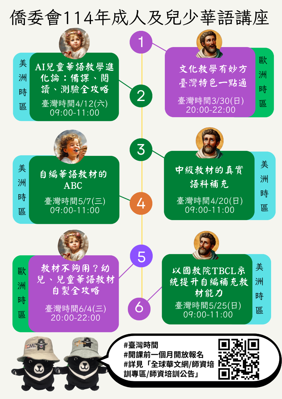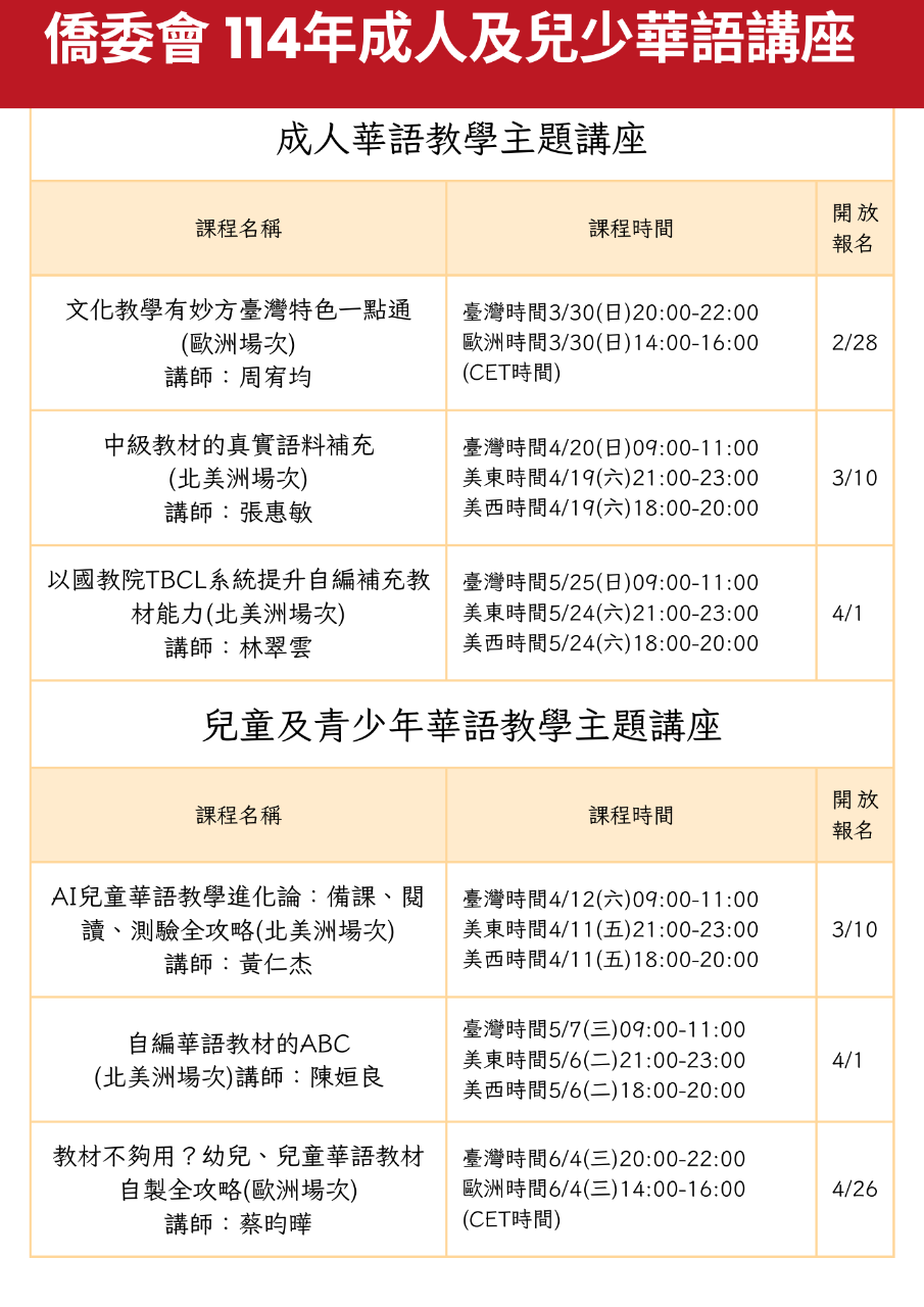 一、 為協助海外各地華語文教師增能並提供渠等多元研習管道,僑委會規劃旨揭共12場次(上、下半年各6場次)線上講座,上半年(3月至6月)課程資訊如下: (一) 研習對象及名額:研習對象以海外僑校及海外主流學校現職臺裔教師為主,每門課程上限80人,報名時須上傳可資證明任教事實之文件以利審核,闕漏文件者恕不受理。 (二) 課程主題及開課時間:課程主題以成人或以兒童青少年為教學對象者規劃兩大類主題,開課時間配合歐洲或北美洲時區開課,每門課程2小時,上半年6門課程主題與開課時間詳如附件課程表。 (三) 報名時間及方式:每門課程均單獨報名,開課前1至2個月將於僑委會僑務活動報名系統開放報名,訊息同步公告於「全球華文網」首頁「最新消息」或「師資培訓專區」,限i僑卡持有者報名,申辦i僑卡相關資訊併載於報名頁面明顯處。 二、 詳見旨揭線上講座報名須知、宣傳海報及課程表(如附件)。