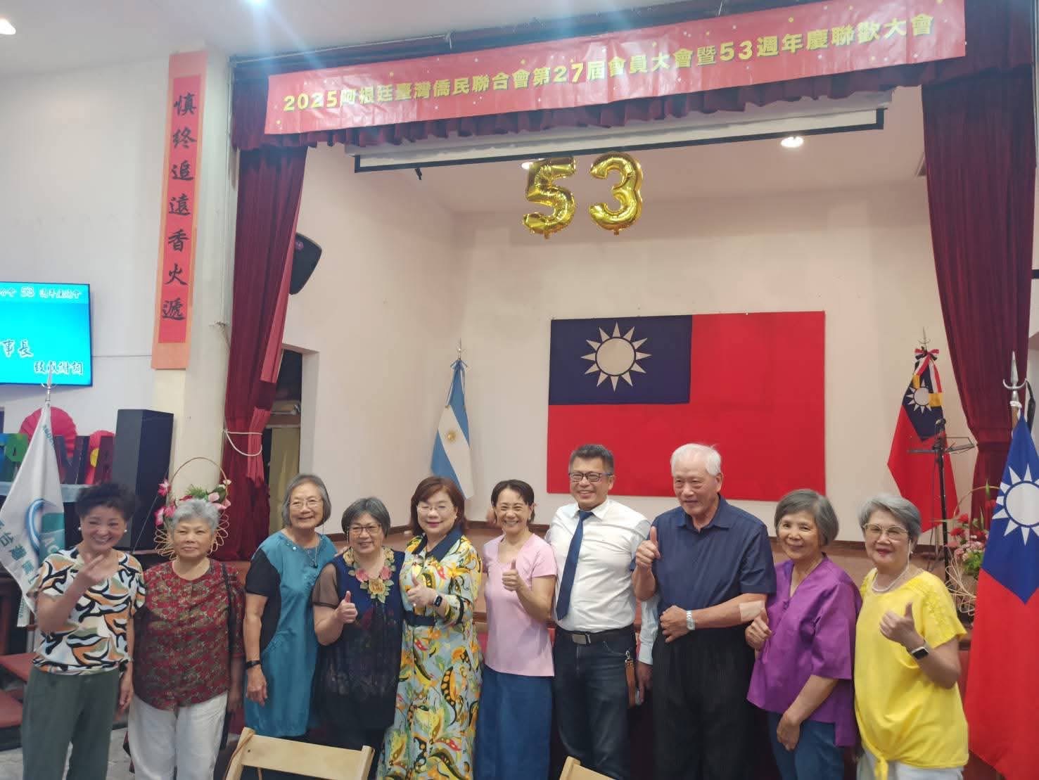阿根廷台灣僑民聯合會於本(114)年12月14日舉辦「第27屆會員大會暨成立53週年慶聯歡會」,本處謝大使妙宏偕同仁應邀出席,並頒贈114年雙十國慶活動有功團體及個人感謝狀,以表彰僑界長期支持政府各項重要活動之貢獻。