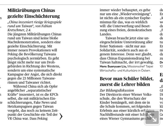 奧地利《新聞報》(Die Presse)於4月5日刊登駐奧地利代表處代表劉玄詠投書,針對中國對台軍事威脅提出嚴正譴責,並呼籲民主世界須認清中共的對外擴張野心。 這篇投書以「中國軍演是有針對性的威嚇」(Militärübungen Chinas gezielte Einschüchterung)為題刊登。劉玄詠表示,近日中國的軍演並非只是展現力量,而是針對台灣人民的心理戰,以散佈恐懼為手段,有目的性的威脅台灣2300萬人。 劉玄詠指出,台灣從未有一天屬於中華人民共和國,但中國卻對台灣施加各式騷擾及攻擊,例如散播仇恨言論及假訊息等。事實是:北京一再宣稱要統一,實際上目標就是要併吞一個自由民主國家。 劉玄詠呼籲自由世界應全力支持台灣,因這不只展現民主國家的團結一致,也符合各國自身利益,因為中國的對外擴張野心不會在併吞台灣後就停止。 《新聞報》創刊於1848年,為奧地利目前歷史悠久之重要媒體,報導範圍涵蓋奧國及國際政經、社會、文化等層面,政經決策階層必讀,每日流通量約25萬人,具奧國全國性輿論重要影響力。