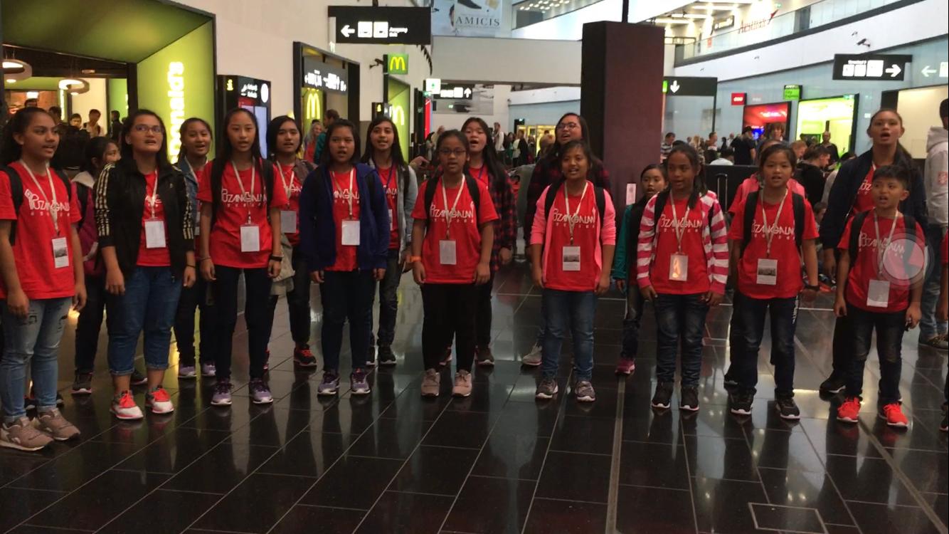 屏東縣PUZANGALAN(希望)兒童合唱團在維也納國際機場大廳快閃演出
