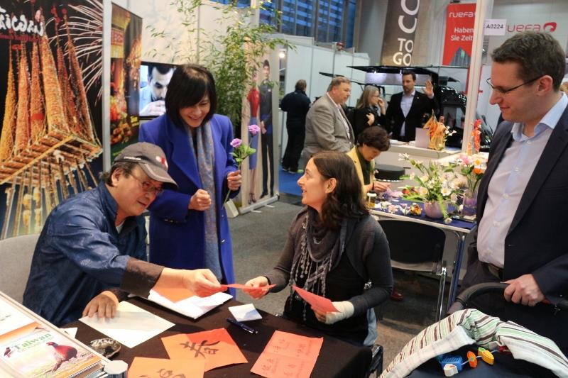 本次臺灣館除提供觀展民眾各項臺灣觀光資訊及紀念品外,並播放宣傳臺灣之特色影片;另現場安排專人為參觀民眾揮毫祝賀新春,以及製作展現臺灣民俗特色之折紙花藝,無不吸引大批人潮駐足。