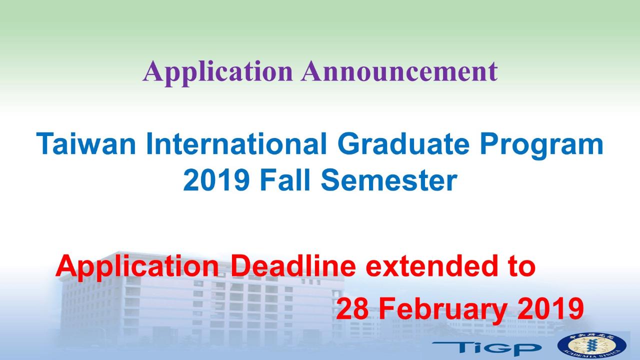 2019 Taiwan International Graduate Program (TIGP) application deadline is extended to 28 February