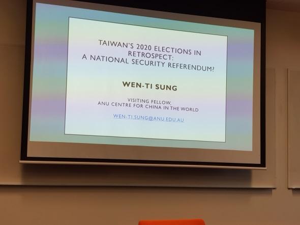 宋文笛於澳洲國家大學演講《2020年臺灣大選回顧:國家安全的公投?》