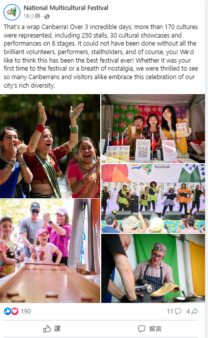 2023年澳洲首都特區政府(ACT)於2月17日至19日在坎培拉市中心辦理「全國多元文化節(National Multicultural Festival)」,促進各族群交流融合。為期3日之節慶活動,計展現170種不同文化、250個展示攤位及30個文化表演,參觀人潮達35萬人。