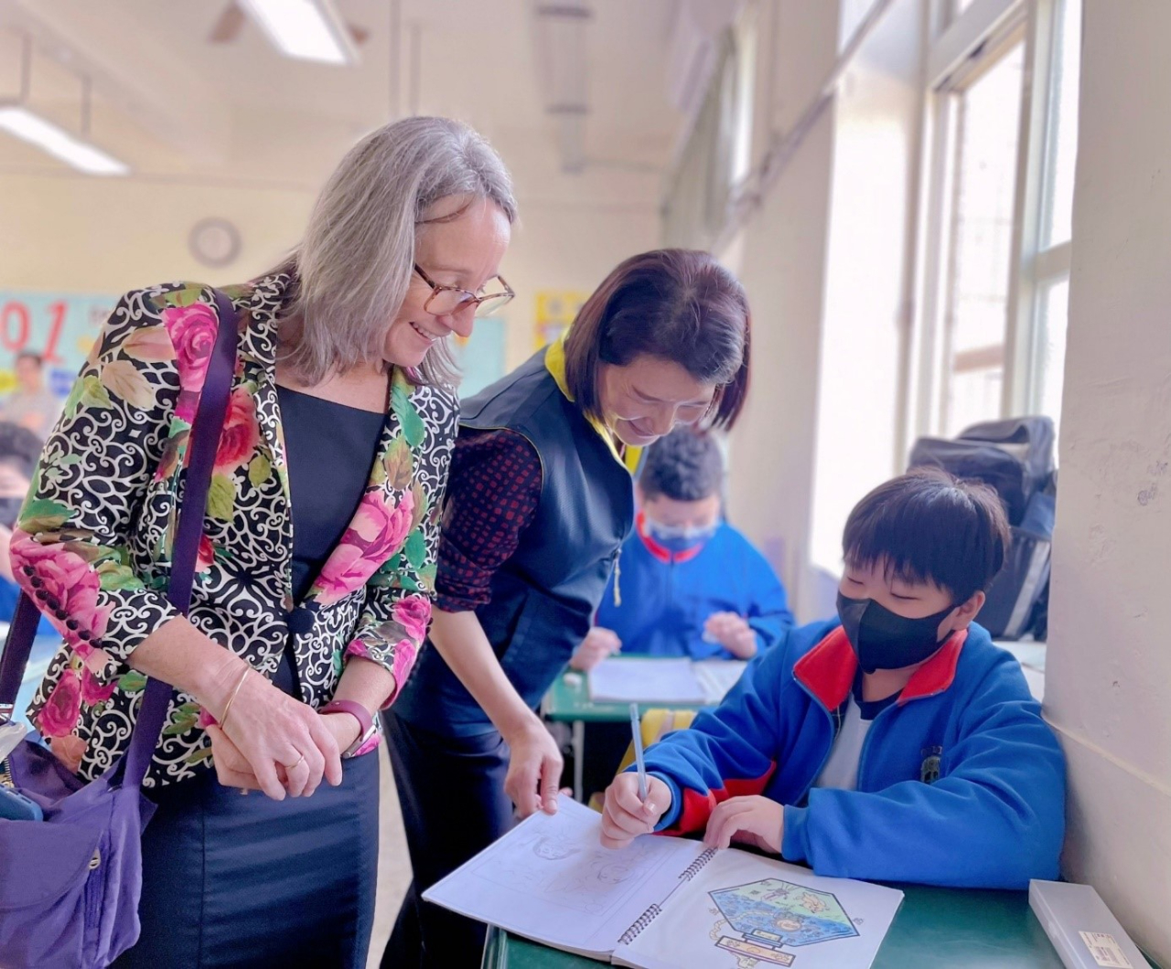 澳洲姊妹校於外師協同雙語課入班觀課; Nealy校長對復興辦學及學生優異表現留下深刻的印象。