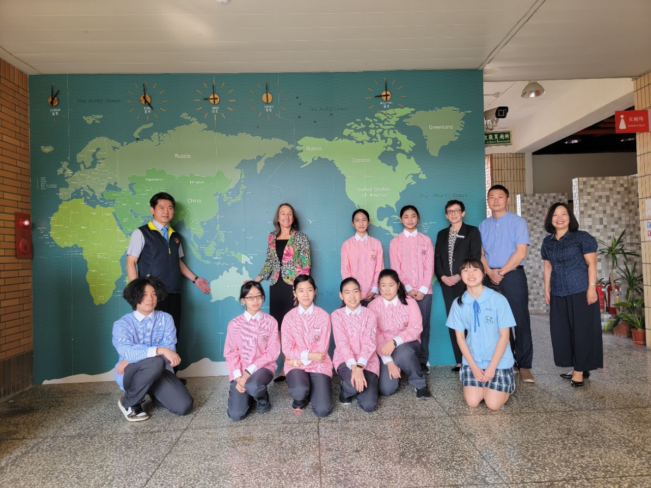 學生用流利的英文在雙語情境牆解說介紹並在世界地圖前合影留念。