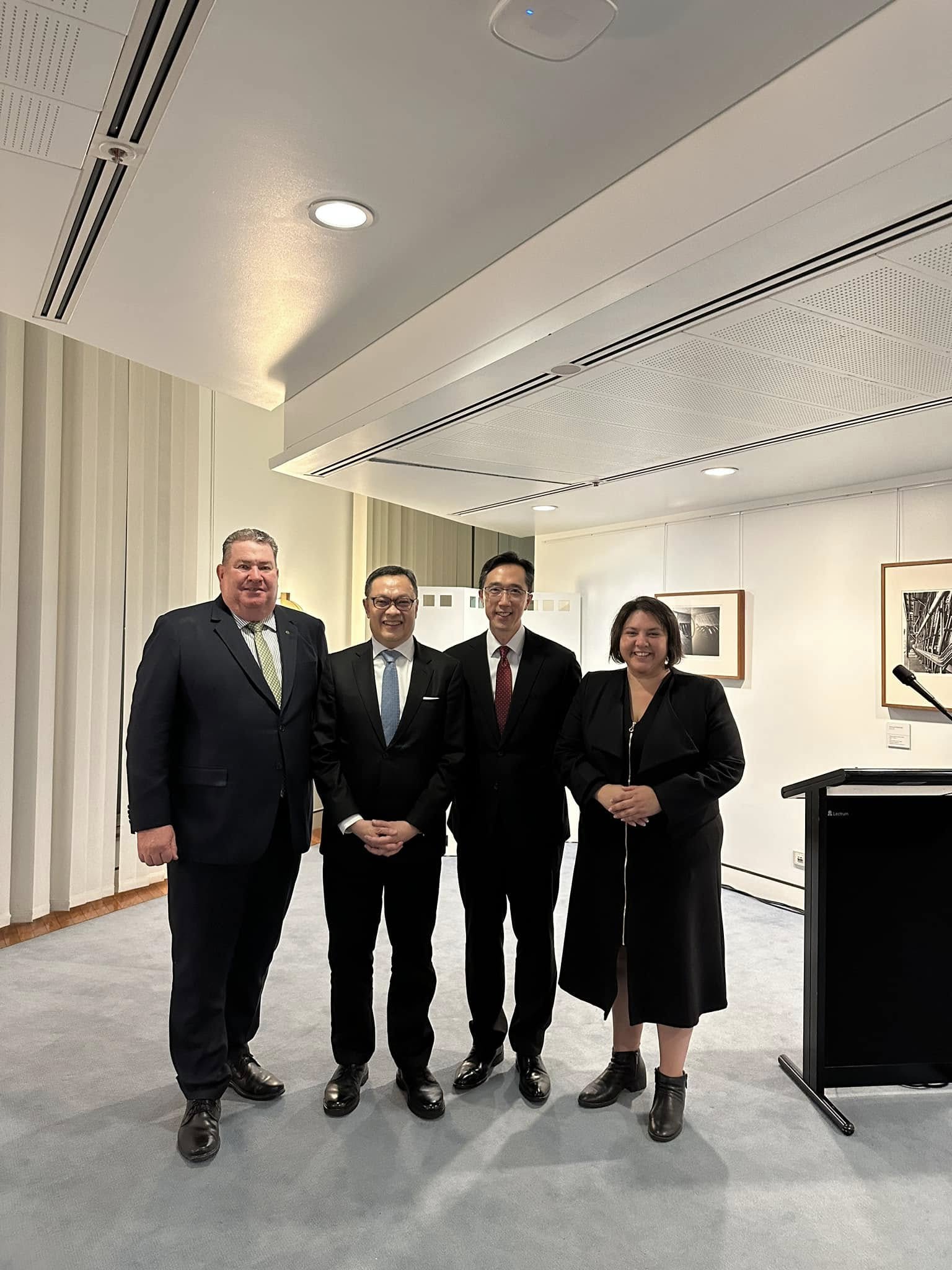 訪問期間,陳次長與徐大使出席澳洲國會友台小組共同主席交接酒會,雙方就民主、自由與繁榮等共同價值展開討論,並表達持續深化台澳雙邊關係的願景。