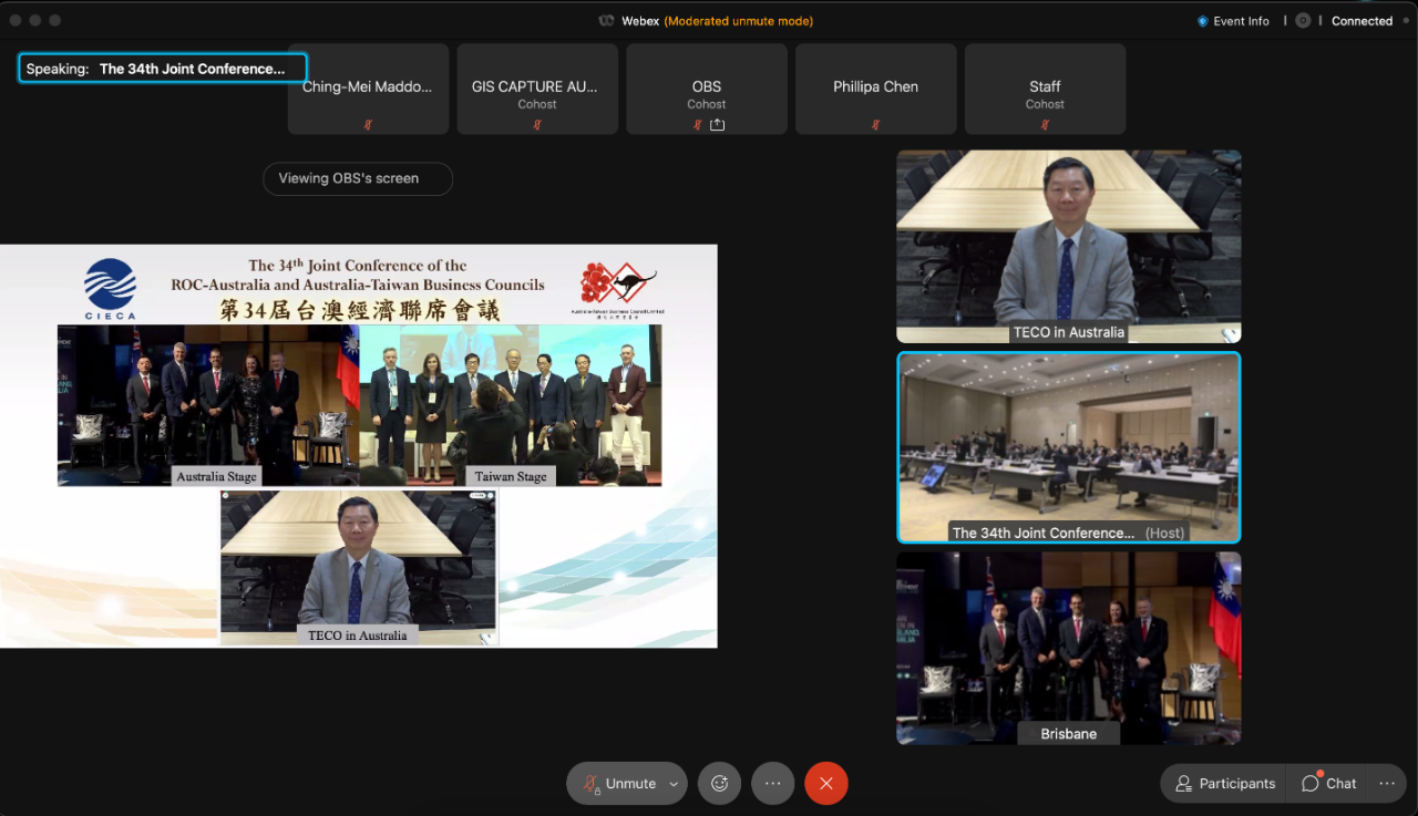 Ms. Wang, Mei-Hua, Minister of Economic Affairs (MOEA), R.O.C. and The Hon. Dan Tehan MP, Minister for Trade, Tourism and Investment, Commonwealth of Australia prepared recorded statements to wish for the success of the conference. Mr. Deng, Chen-chung, Minister without Portfolio, Executive Yuan, R.O.C. addressed the participants in person and offered his encouragement. Rep. Elliott Y. L. Charng, Taipei Economic and Cultural Office in Australia joined the meeting online. Director General Edward Tao, Taipei Economic & Cultural Office, Brisbane attended the conference at Brisbane. Australian attendees included Rep. Jenny Bloomfield, Australian Office Taipei; Mr. Brent Moore, Deputy Representative and Senior Trade & Investment Commissioner, Australian Office Taipei and Commissioner Patrick Hafenstein, Trade & Investment Queensland Taiwan Office.