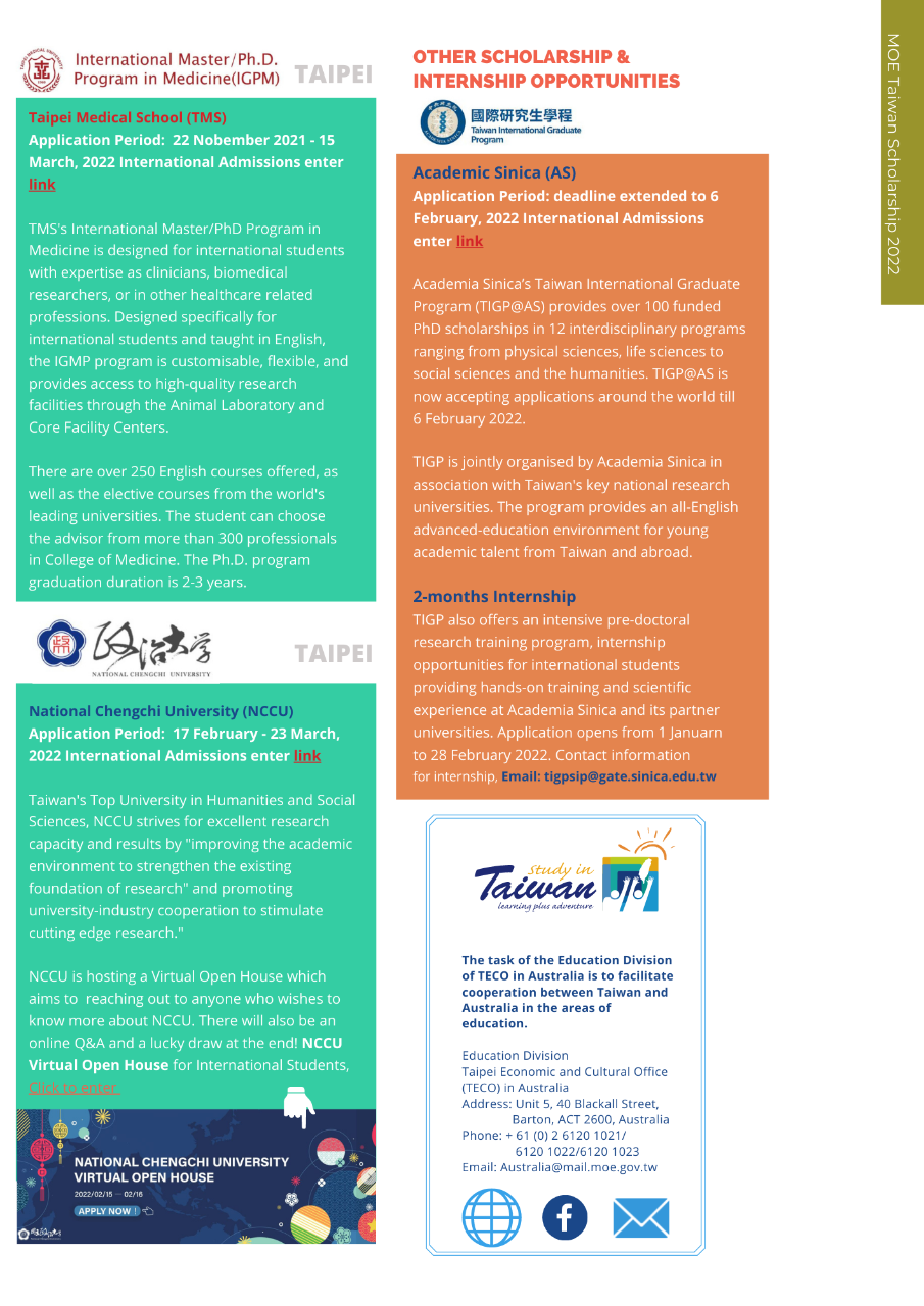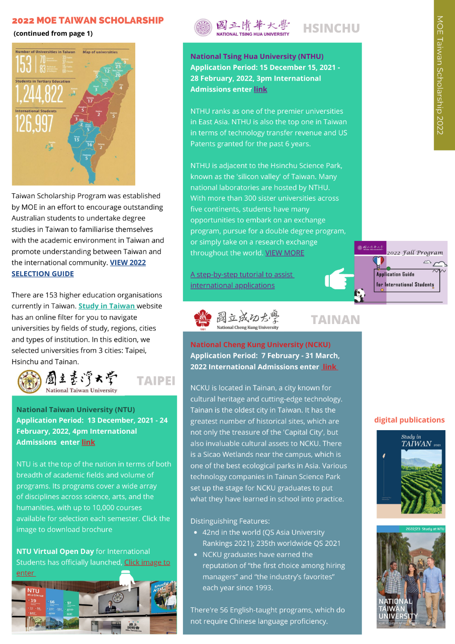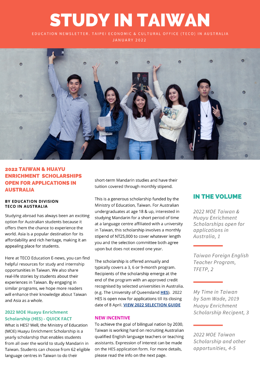 In the January edition of its ‘Study in Taiwan’ E-newsletter, the Taipei Economic and Cultural Office (TECO) in Australia introduces that the Ministry of Education (MOE) is opening its Huayu Enrichment Scholarship and Taiwan Scholarship to be available for Australian applications.