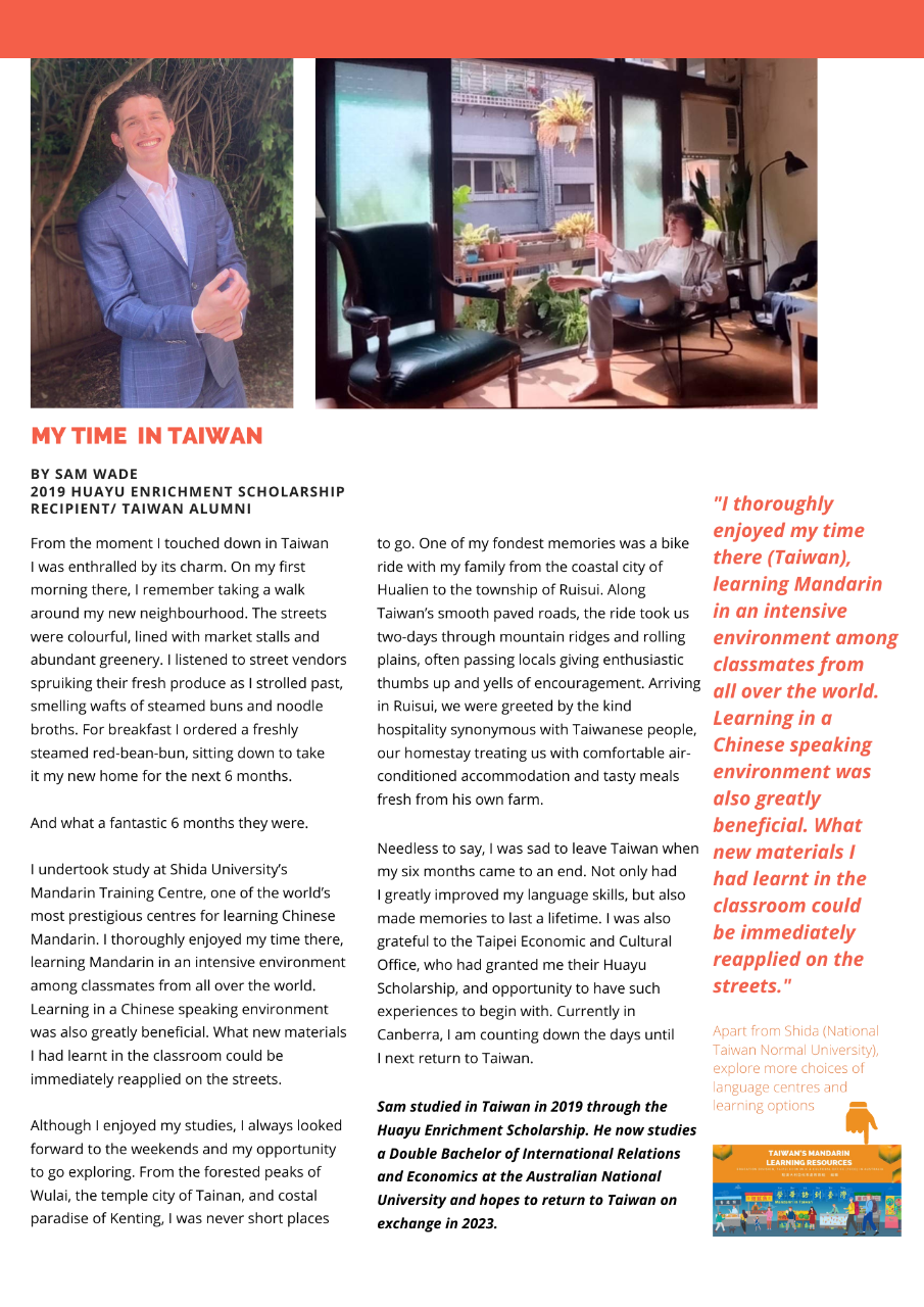 Another article is My Time in Taiwan featured Sam Wade, who studies in Taiwan in 2019 through Huayu Enrichment Scholarship. Sam shared his real-life story about his study experiences in Taiwan. He now studies a double bachelor of International relations and economics at the Australian National University and hopes to return to Taiwan on exchange in 2023.