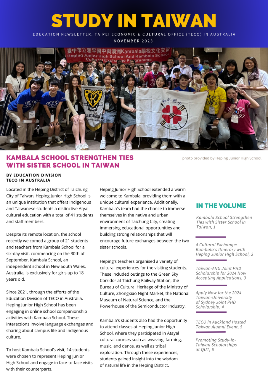 The November edition of the "Study in Taiwan" E-newsletter, the Taipei Economic and Cultural Office (TECO) in Australia highlighted the strengthening of ties between sister schools in Australia and Taiwan.