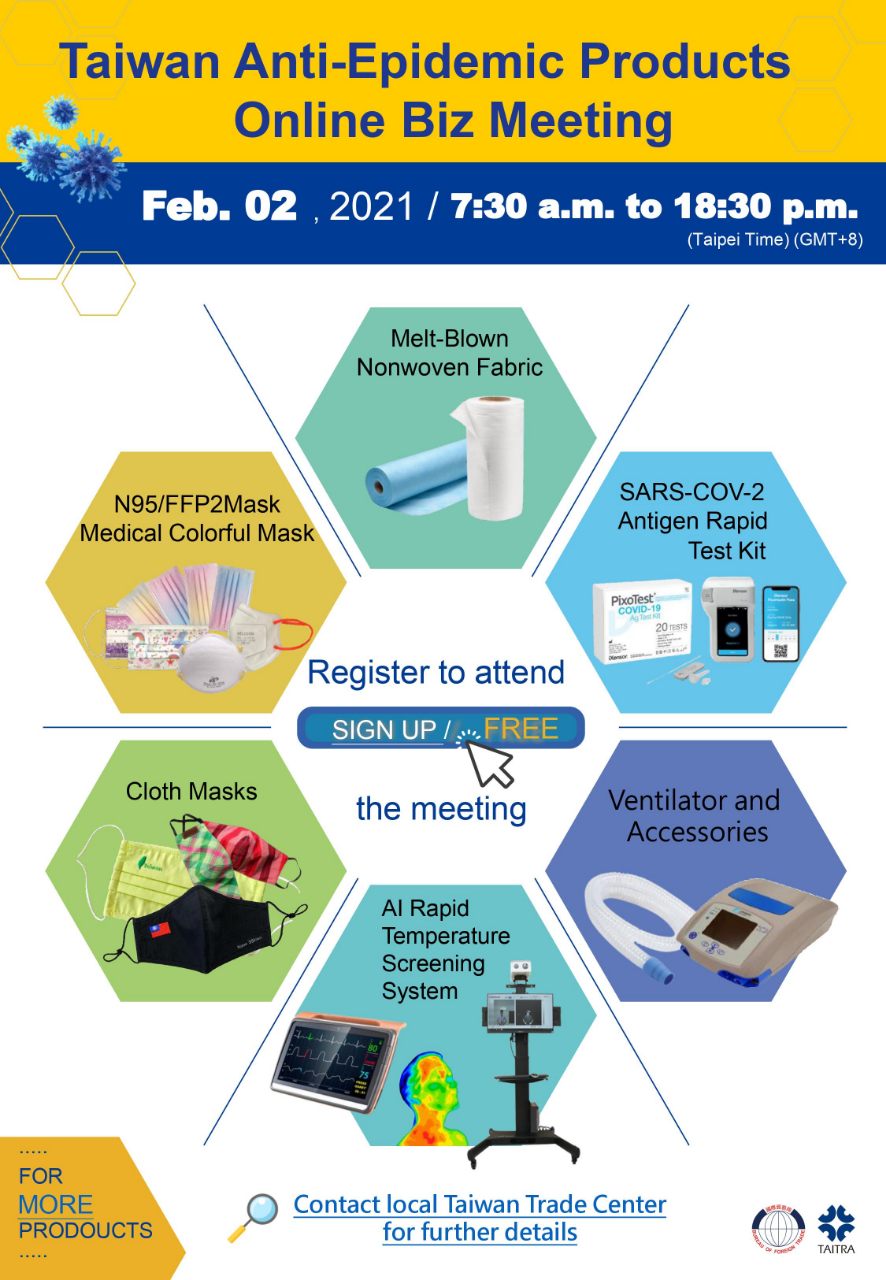 - "2021 Taiwan Anti-Epidemic Products Online Biz Meeting" will be held on 2nd of Feburary 2021, welcome all of interested Medicine relevant Australian company to join in and please register with our Division for further information. Anti-epidemic products manufacturers are includes: