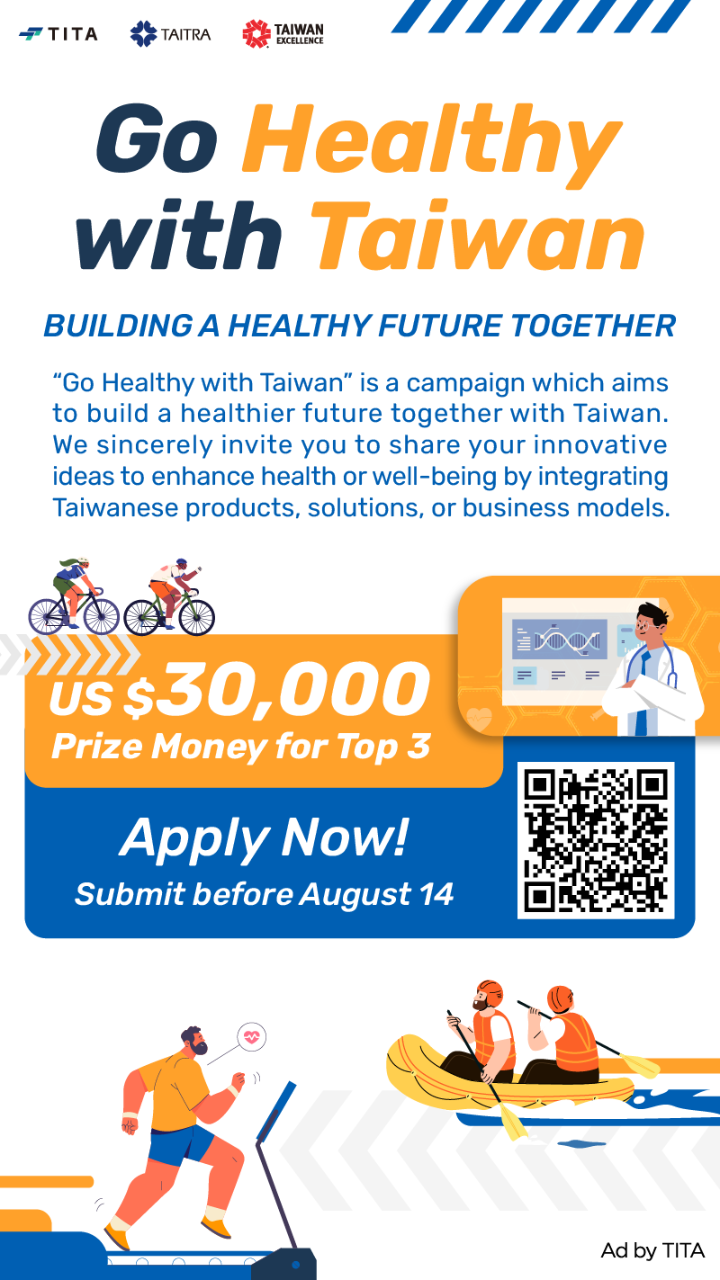 - As global attention on health issues continues to rise, promoting physical and mental well-being has become a collective mission for societies, cities, and businesses worldwide. "2025 Go Healthy with Taiwan Campaign" is now open for proposals that integrate Taiwan's products, solutions or technologies until 14 August, 2025. A maximum of three best proposals will be awarded US$30,000 prize money.