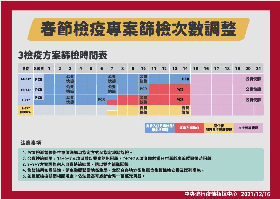 (一) 3方案均於入境時、檢疫第3、7、10、14及第21天(自主健康管理期間第6-7天)進行PCR檢驗或公費快篩(詳附件)。