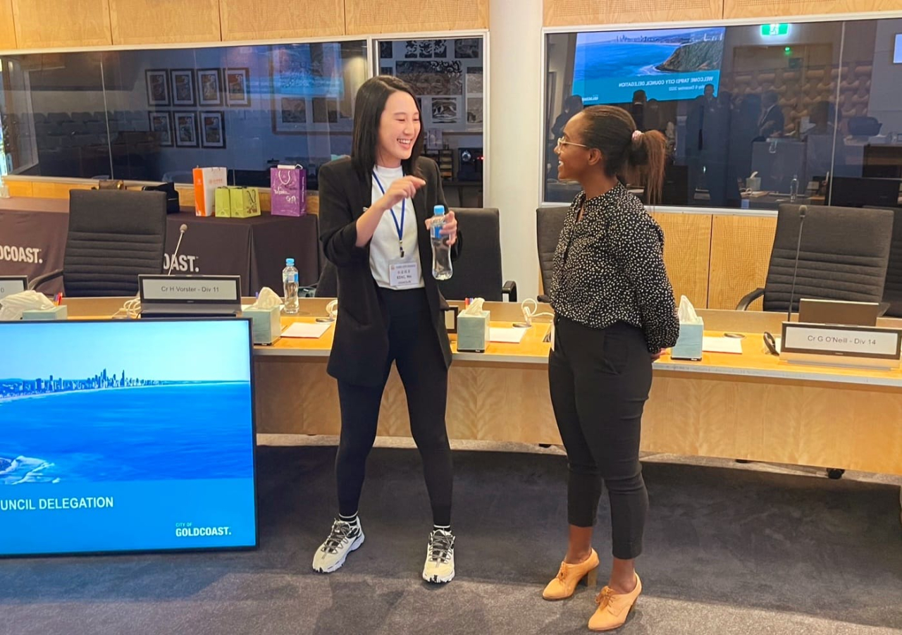 Caldwell 市議員代表公出的市長Tom Tate歡迎訪賓,並致詞說明黃金海岸與台北市締結姐妹市40年,雙方情誼深厚,盼未來繼續在教育與智慧城市科技上合作。李傅議員感謝黃金海岸市議會的熱忱招待,期許雙方議員於國境開放後,加強互訪交流,誠摯邀請Caldwell 議員與同僚擇期訪問台灣,分享市政經驗。