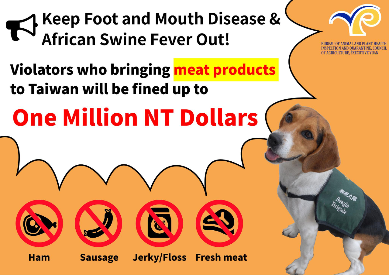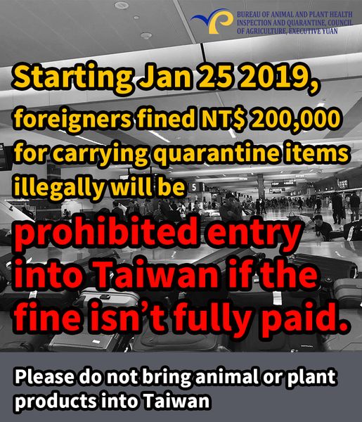 Violators who bringing prohibited meat products to Taiwan will be fined up to one million NT dollars. Foreigners fined NT$200,000 for carrying quarantine items illegally will be prohibited to enter Taiwan if the fine isn't fully paid!
