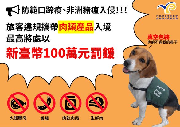 旅客違規攜帶肉類產品入境台灣最高將處以新台幣100萬元罰鍰