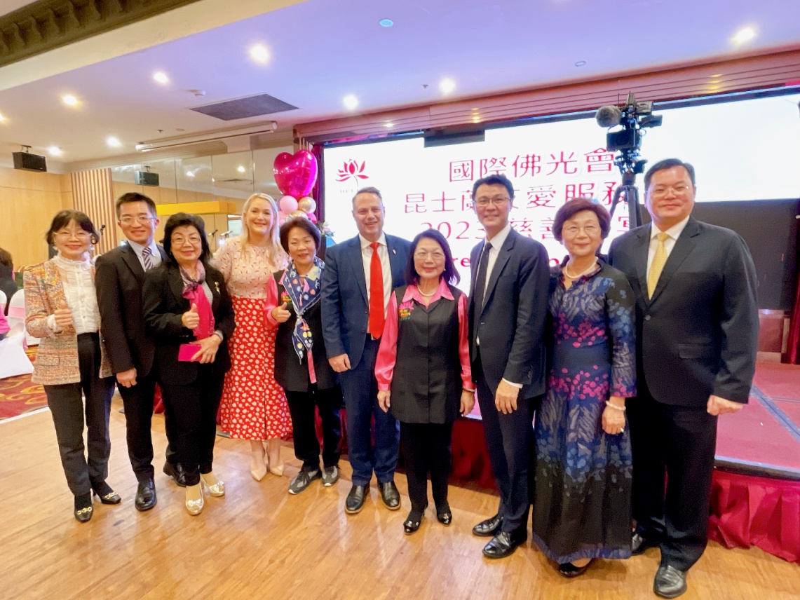 范處長致詞讚許友愛服務隊在依來法師號召及盧僑務諮詢委員淑媛的帶領下,積極投入公益活動,受到主流社會高度肯定,展現台灣軟實力及台灣人良善優質形象。A市長等政要嗣分別上臺致詞,讚揚友愛服務隊對於澳洲社會慈善事務之諸多貢獻。