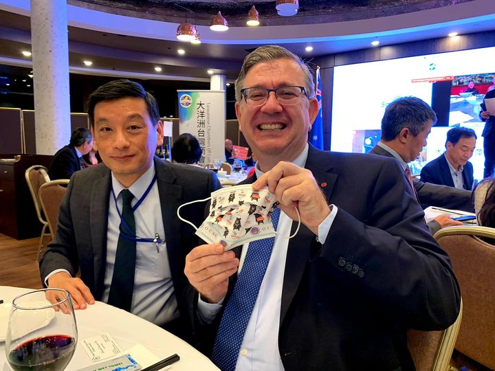 Federal Senator Paul Scarr showed his Taiwan black bear mask to Director General Edward Tao when they attended the Taiwanese Chamber of Commerce banquet dinner on June 19 at Sunnybank. Senator Scarr said that he wears the mask when travel on plane, not just for disease prevention, but also to show his support for “Taiwan can help.”