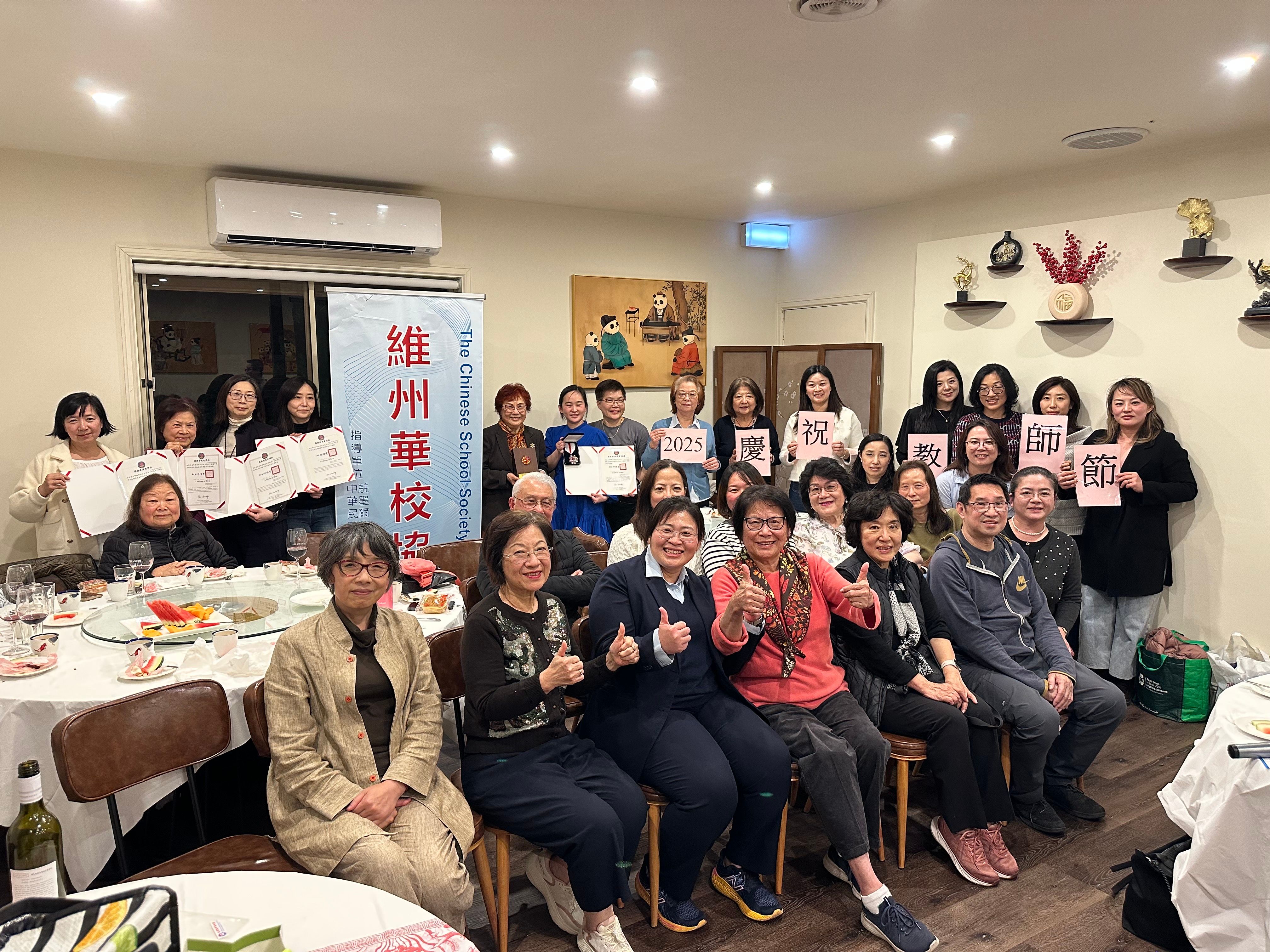 為慶祝教師節,維州華校協會9月28日假鮮生您好海鮮餐廳舉行「2025年慶祝教師節暨資深教師頒獎」活動,僑務諮詢委員王桂鶯、僑務顧問康筱釧、黃肇聰,史賓威中華公學、墨爾本臺灣學校、福爾摩沙中文學校、佛光中華學校及墨爾本華人浸信會中文學校等5校校長及老師30餘人與會。駐墨爾本辦事處副組長楊容清代表處長呂明澤出席致意, 維州華校協會會長、僑務顧問楊瑾玲致詞時表示,感謝各校長期支持協會發展,並向全體教師致上教師節祝福。今年協會主辦的「漢字文化節」及「華文教師研習會」,在各校通力協助下順利舉行,成果豐碩。她期許未來持續凝聚僑校力量,共同推廣正體字華語文教育,讓台灣文化在海外持續深耕、發揚光大。楊容清副組長感謝僑校教師在海外辛勤耕耘,讓正體字華語教學在海外閃閃發光,也讓台灣文化在當地深耕發展。僑務諮詢委員王桂鶯、僑務顧問康筱釧、黃肇聰、福爾摩沙中文學校校長劉怡君、墨爾本臺灣學校校長黃思華、佛光中華學校主任郭小雯及浸信會中文學校校長廖吳愛儀也先後向出席老師致意。 其後,楊容清代表頒發僑委會獎勵資深僑校教師獎章及獎狀,本次獲獎校長及教師計有8位,任職於史賓威中華公學的蘇雪梨副校長,獲頒40年資深教師獎座;任職於史賓威中華公學的陳智美老師獲頒20年資深教師獎章;福爾摩沙中文學校的劉怡君校長、李陽老師、墨爾本臺灣學校的徐婉瑄老師、史賓威中華公學的曹敏儀及墨爾本華人浸信會中文學校彭恩沛老師獲10年資深教師獎狀,任職於墨爾本臺灣學校的顏雪朱老師獲頒5年資深教師獎狀,肯定他們長期在正體華語文教育的耕耘與貢獻。 頒獎典禮結束後,與會者一同享用豐盛餐點,交流教學經驗。主辦單位特別準備中秋月餅,祝賀佳節,整場活動氣氛溫馨,歡笑聲不斷。