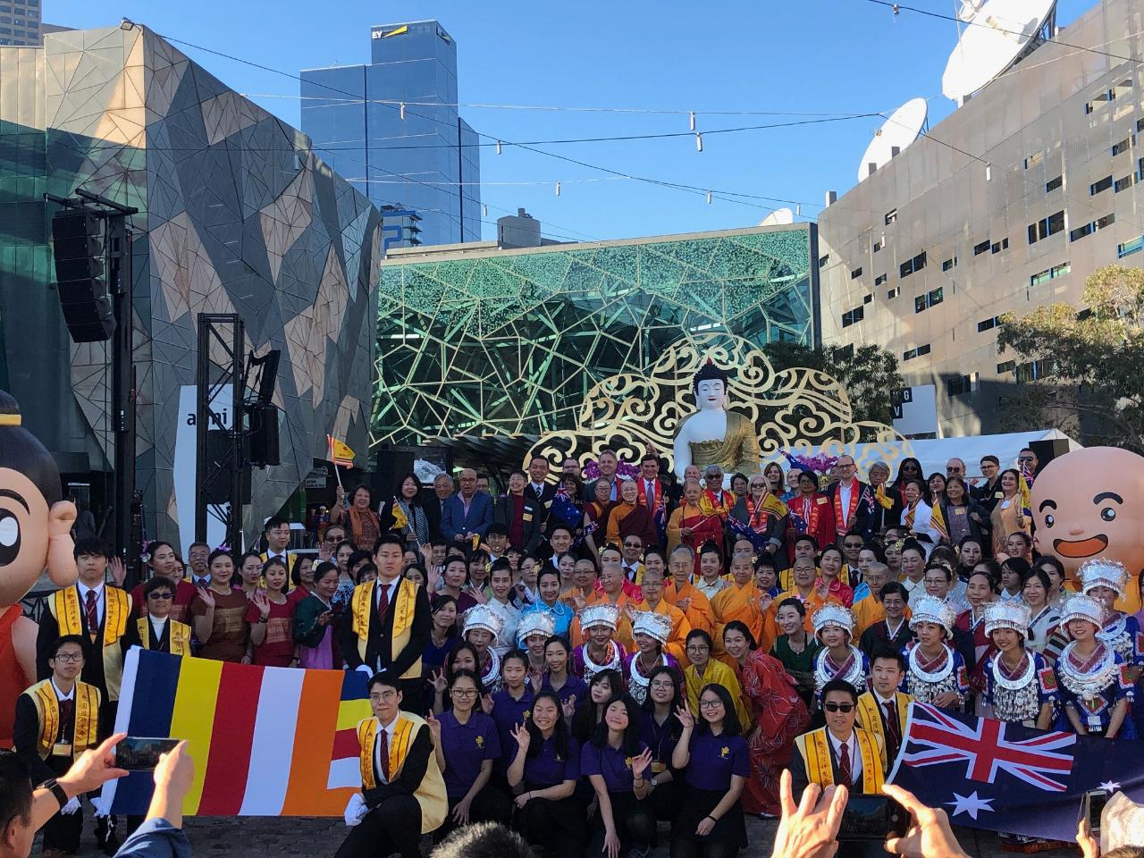 墨爾本佛光山及國際佛光會墨爾本協會於本(108)年5月18日至19日在聯邦廣場(Federation Square)舉辦2019年「佛誕節暨多元文化嘉年華會」,浴佛典禮開幕儀式於18日下午2時舉行,本處林處長偕駐處同仁應邀出席,除佛光山歐洲副住持覺如法師、國際佛光會墨爾本協會會長余文傑外,維州眾議員Kaushaliya Vaghela (代表維州州長Daniel Andrews及多元文化事務廳廳長Richard Wynne)、消費者事務廳影子廳長及影子財政次長Neil Angus(代表反對黨維州領袖Michael O’Brien)、維州參議員Raff Ciccone(代表反對黨聯邦領袖Bill Shorten)、墨爾本市代理市長Arron Wood、維州多元文化委員會委員Mimmie Claudine Watts、聯邦廣場商業及公共事務部總經理Suzana Bishop、萬年興市副市長Anna Chen、白馬市市議員Tina Liu、僑務諮詢委員劉文灼等僑界領袖出席。 「佛誕節暨多元文化嘉年華會」於1996年在墨爾本首次舉辦,本年係第24年,並連續17年在墨爾本地標聯邦廣場舉行,已成為墨爾本地區多元文化年度盛事。現場除邀請貴賓致詞、演唱澳洲國歌及年輕學子歌舞表演外,另擺設多元文化攤位,包括佛教藝術、佛學講座、音樂、禪書畫示範及素食園遊會等,林處長偕同仁於開幕儀式後特赴僑胞所設攤位並問候致意,兩日活動共計吸引數萬人次前來參觀,活動熱鬧精彩。