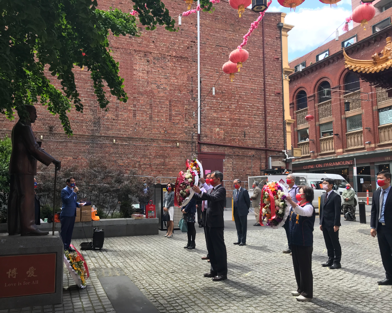 國父銅像委員會主席鄭毅中、墨爾本白馬市議員劉昱婷、維州救世軍傅三川上校、墨爾本台灣商會前會長張戴麒(兼代表張吳雪娥僑務委員)、僑務諮詢委員吳天佐、王桂鶯、劉國強等嘉賓依序對國父孫中山先生銅像獻花致意。