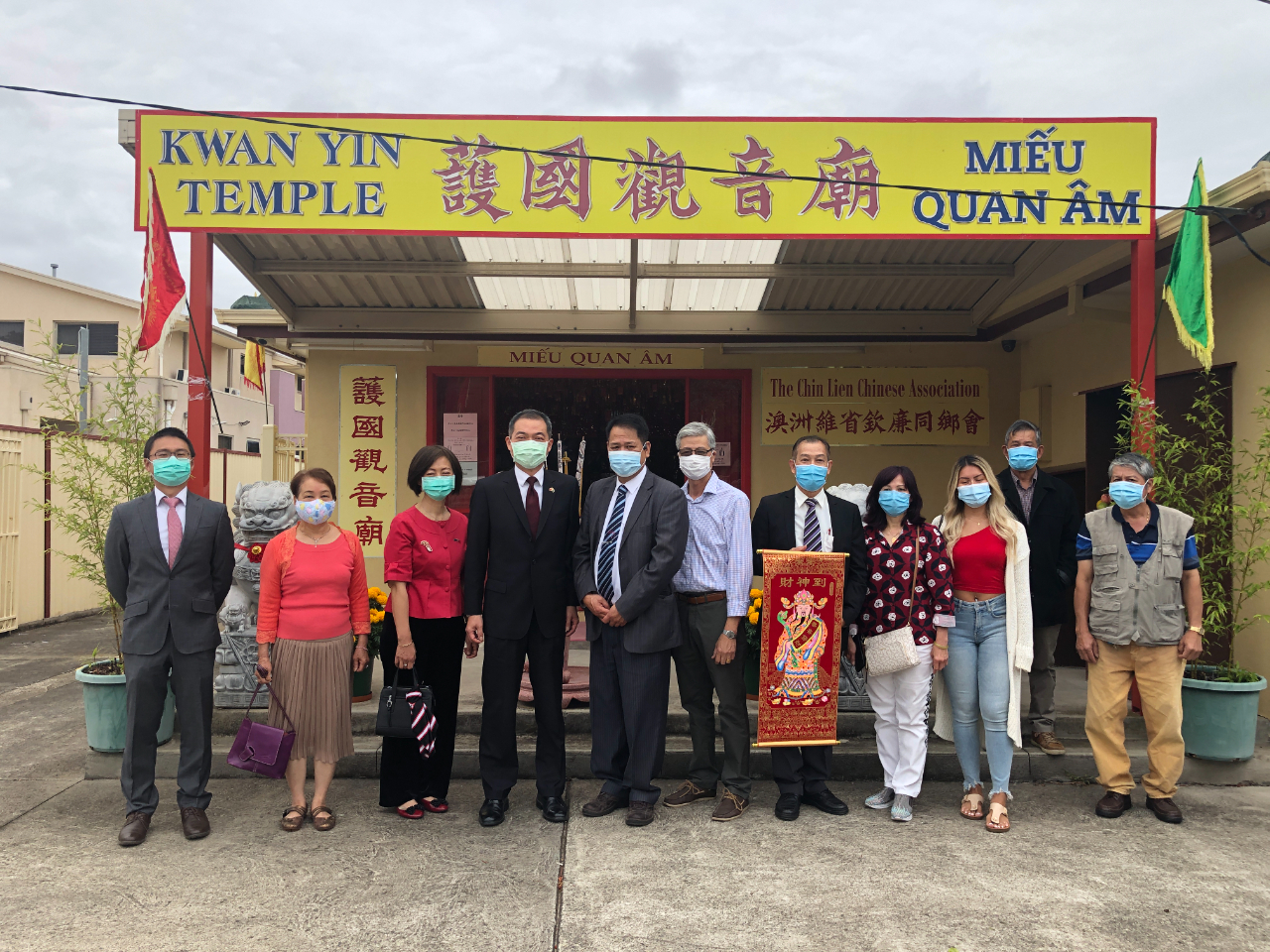 駐墨爾本臺北經濟文化辦事處處長林起文夫婦2月12日大年初一上午偕王組長偉年及僑務秘書康雅雄前往澳洲維省欽廉同鄉會會館「護國觀音廟」向該會理監事拜年。會長馮昌成、榮譽會長林漢強夫婦、僑務諮詢委員劉國強、白馬市市議員劉昱婷及欽廉同鄉會理監事等均在場互道恭喜。僑務委員張吳雪娥及僑務諮詢委員王桂鶯雖無法到場,仍捐贈香油支持欽廉同鄉會,感謝該會長期支持中華民國並參與台灣社團活動。