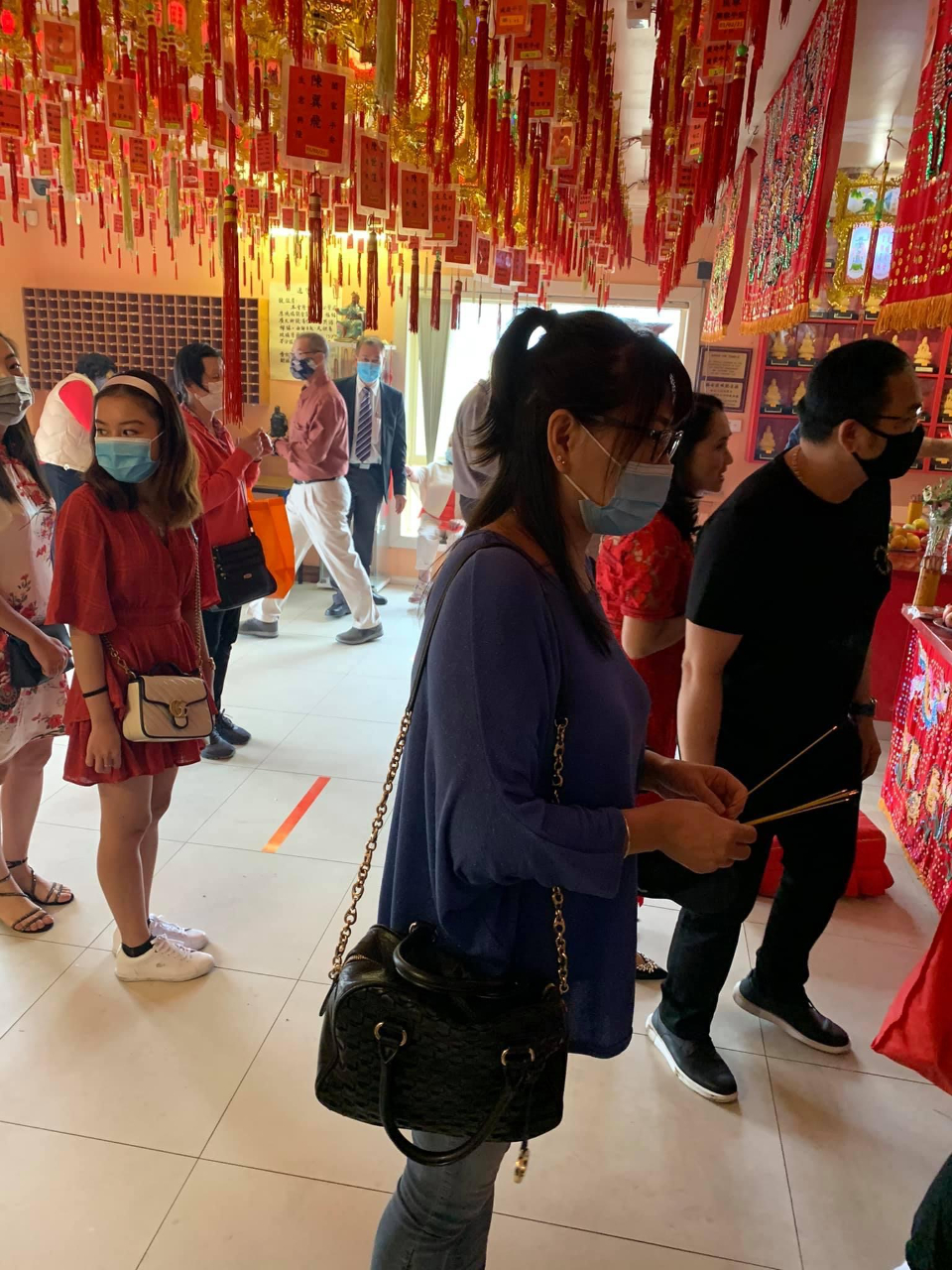 農曆新年期間觀音廟配合維州政府防疫措施,室內管制人數並請信眾配戴口罩。今年人潮雖減少,但為世界祈福的心更甚以往,現場隨時可見欽廉同鄉會幹部們帶領信眾向觀世音菩薩上香,氣氛溫馨莊重。