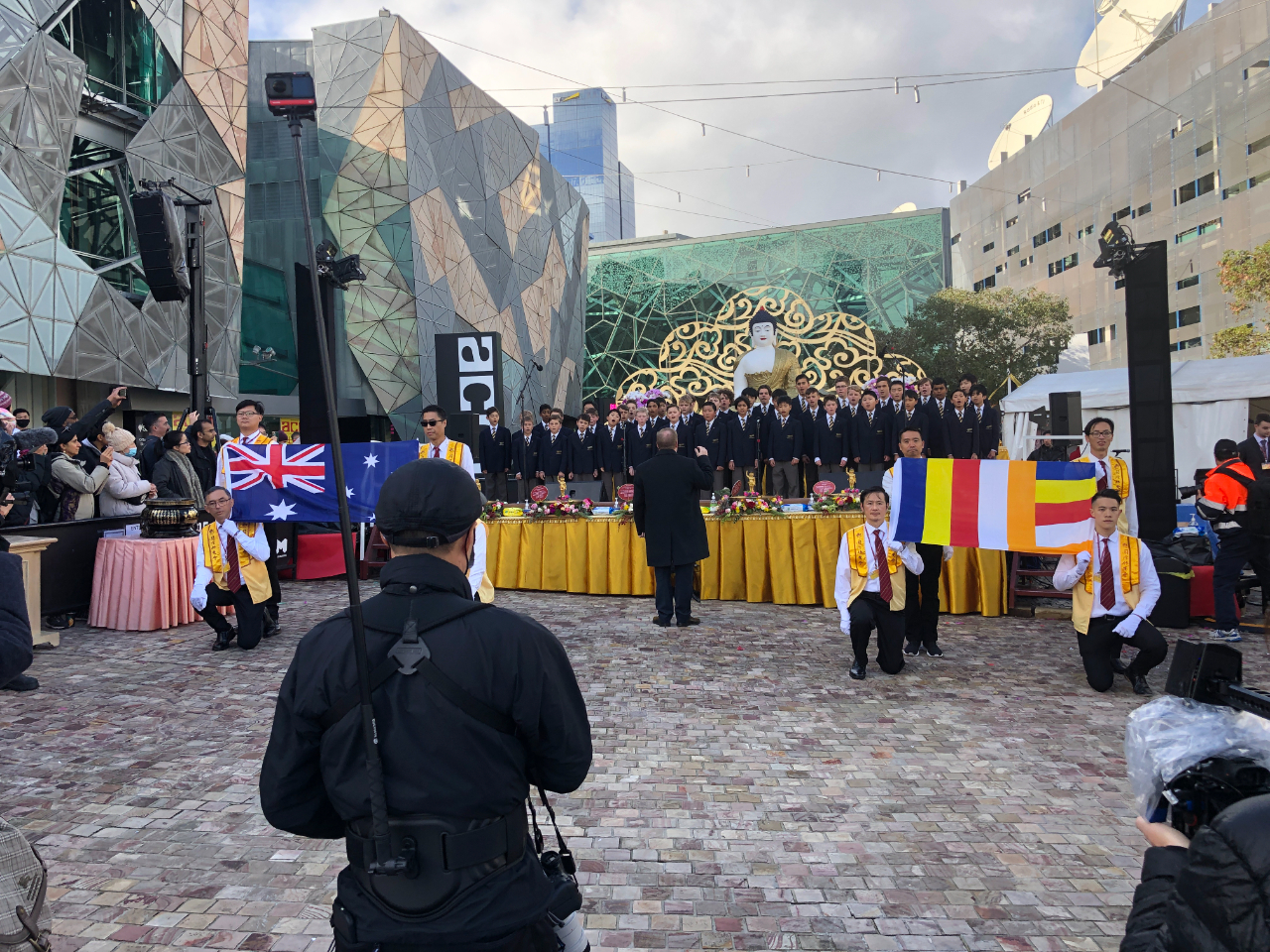 活動開始由「墨爾本中華青年會」帶來精彩的舞龍舞獅吸引眾人圍觀,接著進行向原住先民致敬的「Welcome to Country」傳統儀式,隨後恭迎澳洲國旗及國際佛教旗進場,並由「國家男童唱詩班」(National Boys Choir)領唱澳洲國歌、進行「世界和平祈福儀式」(World Peace Blessing Ceremony )及浴佛典禮,闡揚佛教尊敬、平等及憐憫的深義,場面莊嚴肅穆。