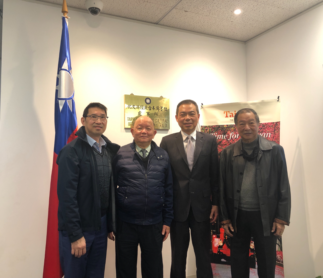 「墨爾本中華公會」新任主席劉國強(左2)、副主席黃肇聰(左1)及會務顧問吳天佐(右1)一行三人7月9日拜會林起文處長(右2)。
