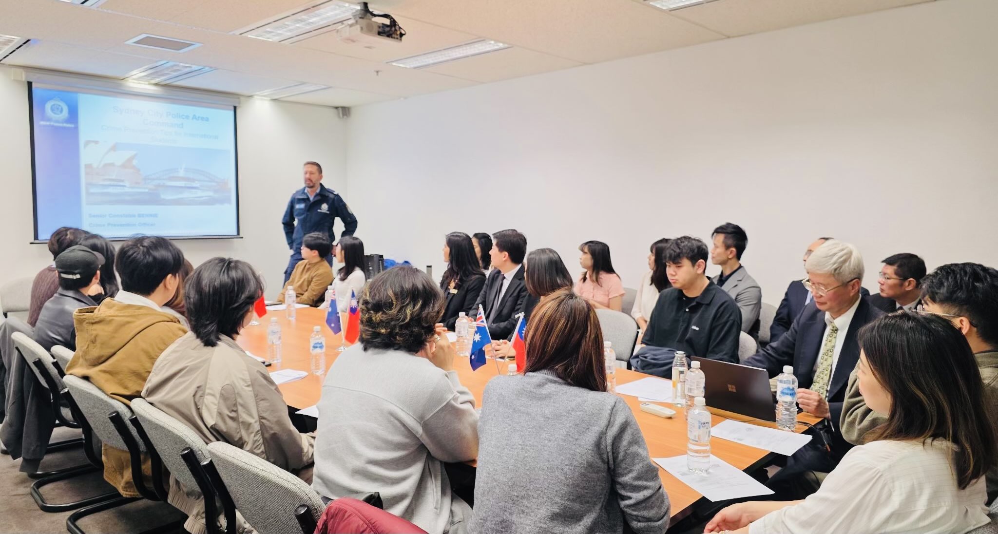 辦事處亦安排各業務單位包括僑教中心、領務、移民、教育等同仁分別就與我留學生相關業務進行說明與宣導外,雪梨市警察局也應辦事處邀請,特別派遣資深警官及多元文化聯絡官來處向台灣留學生進行人身安全注意事項的簡報及宣導,其中包含各種緊急聯繫管道以及新州警署Emergency Plus APP、Crime Stopper、Scam Alert、ID Support等多項犯罪防治機制,會中也就近來猖獗的各式詐騙案詳細解說,並與同學就所遇案例互動交流。
