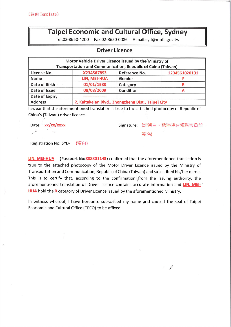• 驗證目的:持照人持憑本處核發之英文譯本驗證本併其他新州交通廳要求之文件至新南威爾斯州服務中心(Services NSW)換領新州小客車駕照。