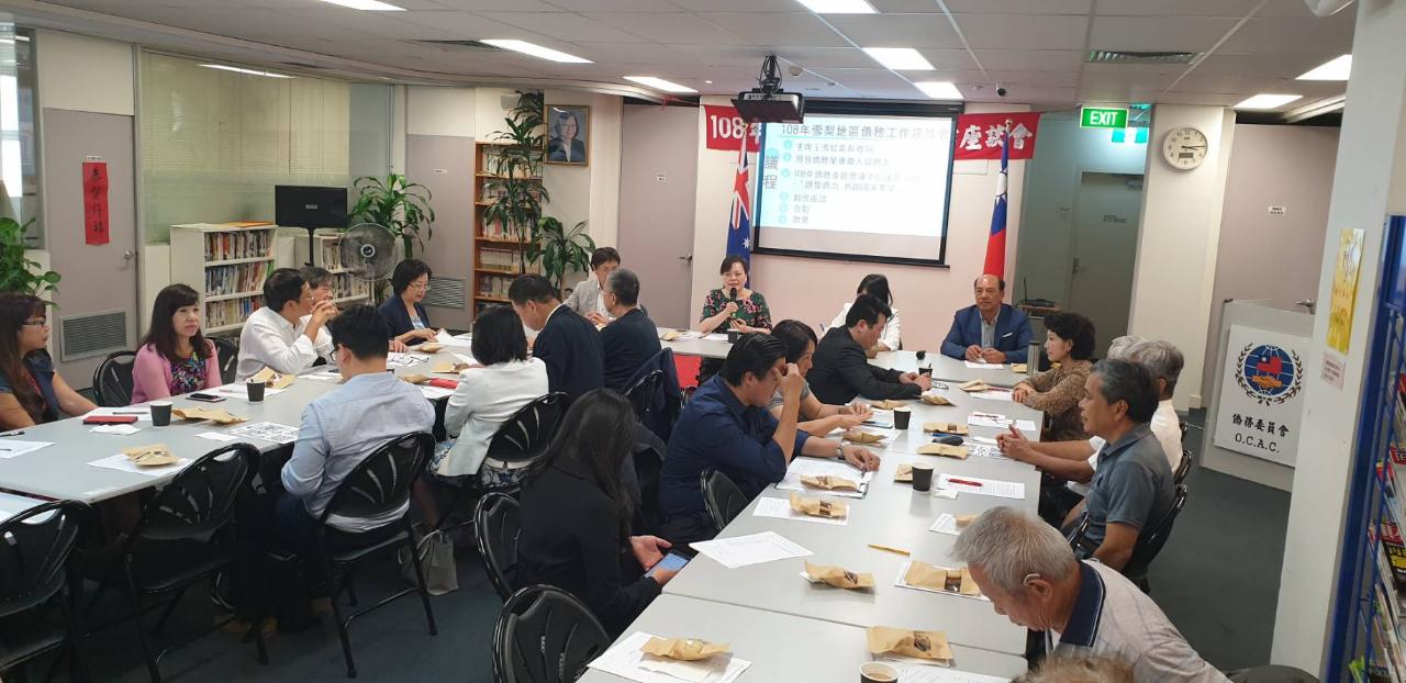 108年雪梨地區僑務工作座談會於3月21日假雪梨華僑文教服務中心舉辦,由駐雪梨台北經濟文化辦事處王處長雪虹主持,王處長首先表示僑胞是我國面對世界的後盾與優勢,感謝僑界大力的支持與贊助,讓目前正在雪梨舉辦的故宮特展,能夠順利成功。