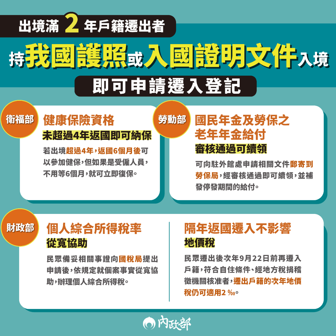 對於海外國人戶籍遷出後,恐影響健保、國民年金與勞工保險之老年給付、個人綜合所得稅率、地價稅率等,政府相關單位包括僑委會、衛福部、勞動部、財政部及內政部等已有開會協調,相關權益都不會受影響,內政部並特別提供圖片解說相關規定,請民眾可以放心。