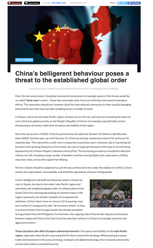 本處蔡大使明彥投書「歐洲郵報」 (The European Post),呼籲歐盟就印太安全局勢提出戰略展望,並盼台灣海峽議題在任何歐盟印太戰略展望均不缺席。為維護印太地區之和平與穩定,歐洲應運用其力量在印太地區扮演更積極角色。