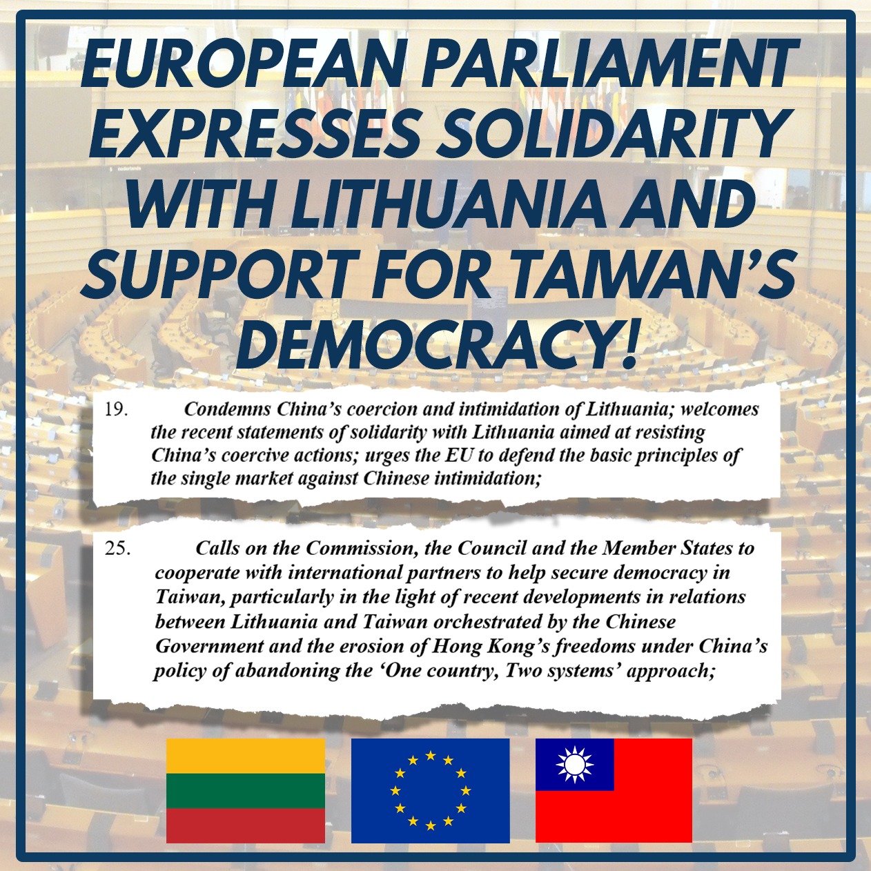 決議案亦呼籲歐盟及會員國與國際夥伴合作,保障台灣的民主。同時譴責中國對立陶宛的脅迫與恫嚇,歡迎近期聲援立陶宛的相關行動,敦促歐盟捍衛單一市場的基本原則。