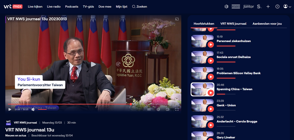 2. VRT新聞網站於3月13日刊登影片「民主國家台灣堅決反對威權中國」(Taiwan het democratische land dat standhoudt tegen het autoritaire China),該影片並於同(13)日在VRT電視頻道下午1時及7時新聞播出。