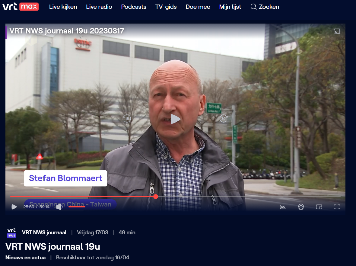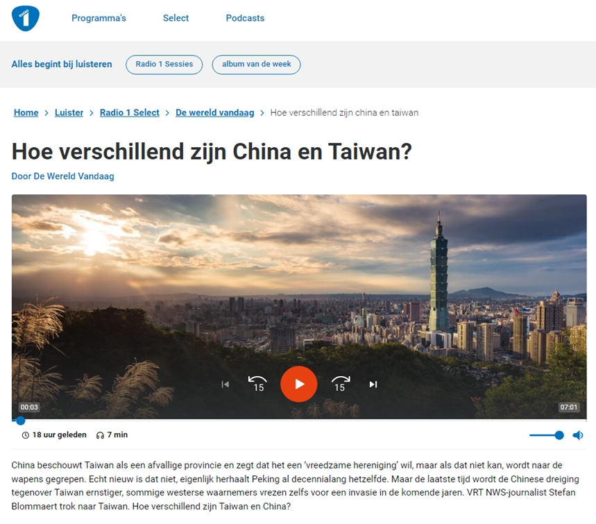 4. VRT「電台一台」(Radio 1)於 3月14日專訪Stefan Blommaert之廣播:中國與台灣不同之處為何?( Hoe verschillend zijn China en Taiwan?)