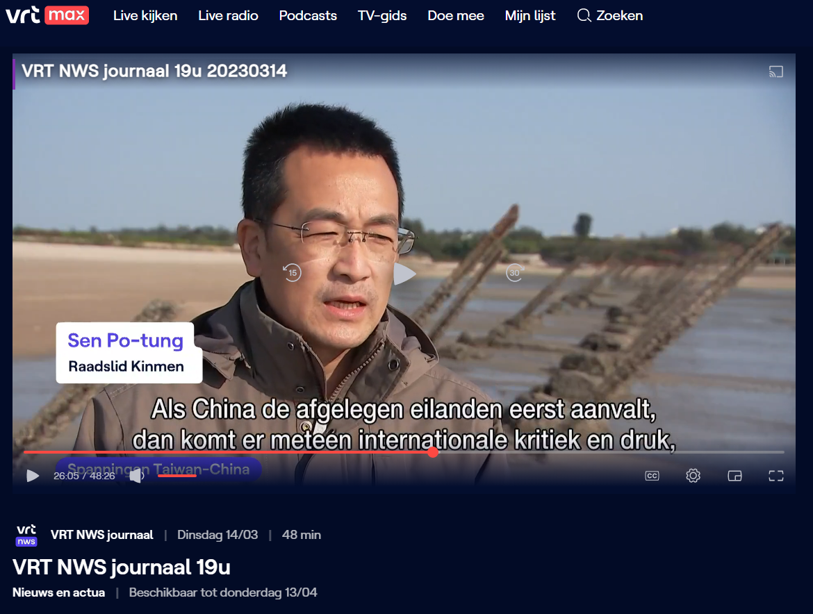 3. VRT新聞網站於3月14日刊登影片「VRT記者在金門:兩岸戰爭從未真正停止 」(Onze reporter op enkele kilometers van de Chinese grens: "Oorlog tussen China en Taiwan is eigenlijk nooit gestopt"),該影片並於同日下午在VRT電視頻道下午7時新聞播出。