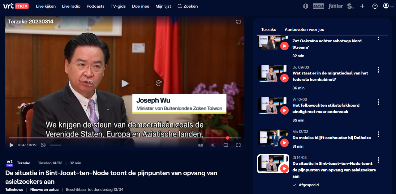 5. VRT「說到重點」(Terzake)節目於3月14日播出影片 「並非害怕,而是憤怒」: 台灣不願成為地緣政治之玩物("Zijn niet bang, maar boos": Taiwan tegen wil en dank geopolitieke speelbal),該影片並刊載於VRT新聞網站。